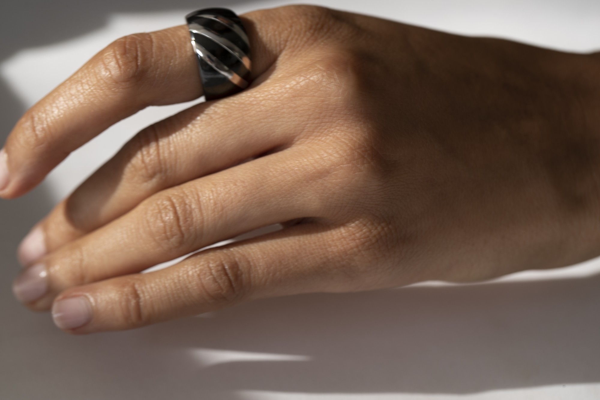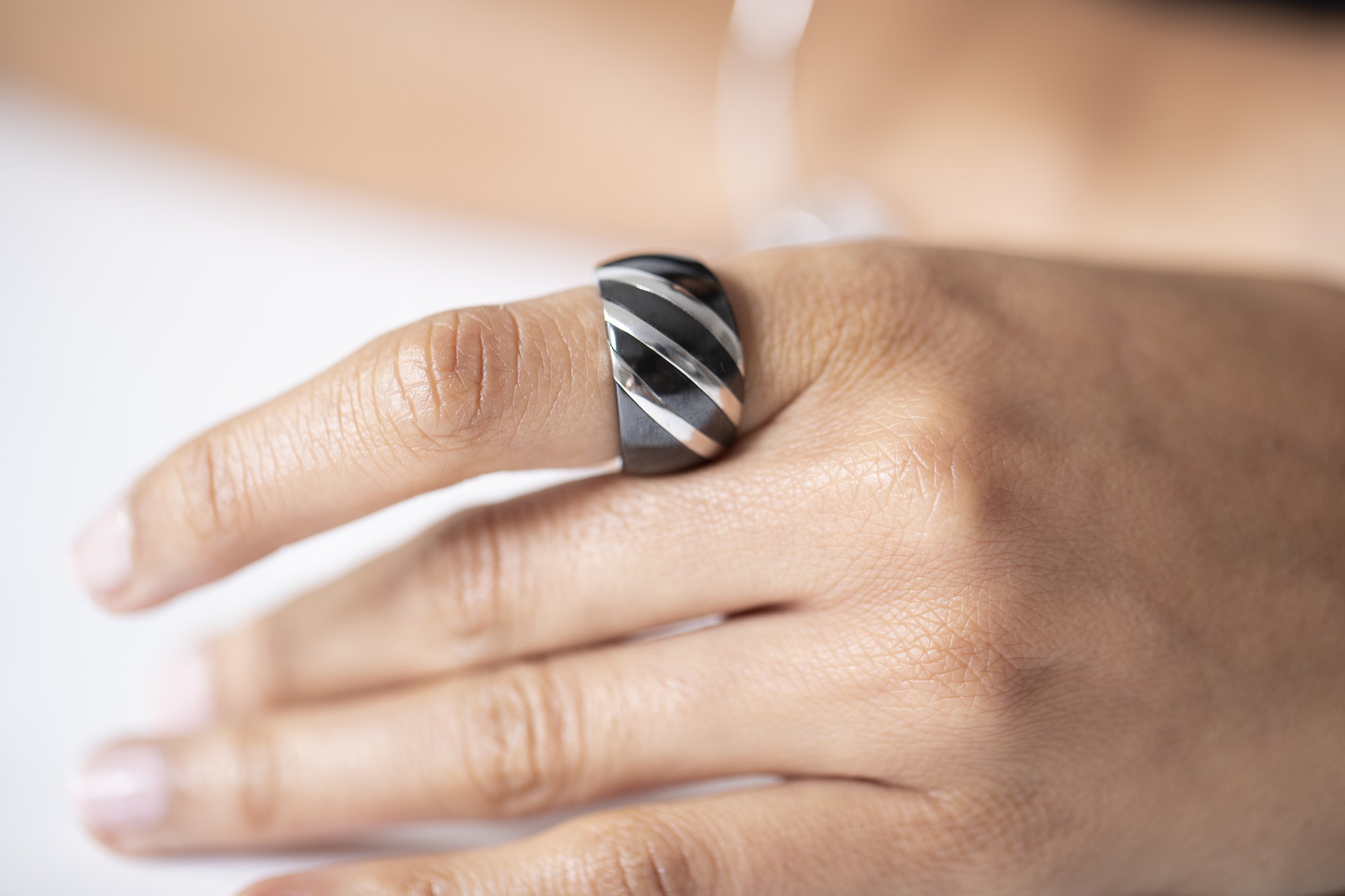 La version noire de la bague Sardaegna révèle une beauté plus intense, presque minérale. La céramique noire lisse contraste avec les lignes d’argent poli, créant un jeu de reflets saisissant et moderne.