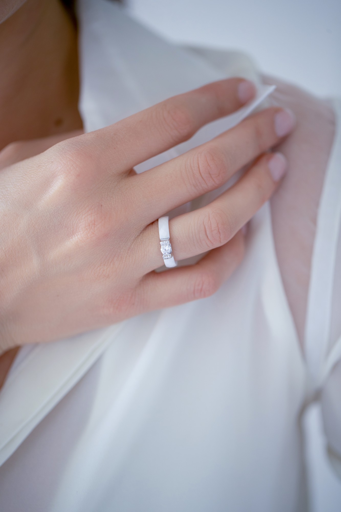 Fine et lumineuse, la bague Corinth célèbre la beauté de la simplicité. Sa céramique blanche à relief capte la lumière avec délicatesse, tandis qu’un oxyde de zirconium central, serti d’argent, diffuse un éclat pur et intemporel.