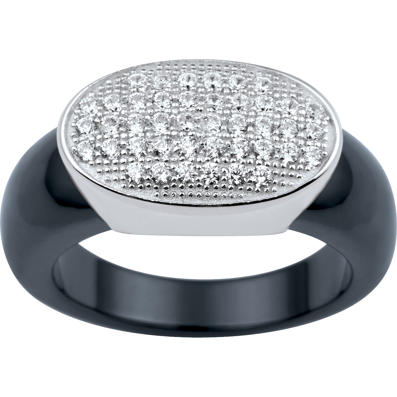 La bague Arabesque séduit par son élégance géométrique et sa brillance maîtrisée. Sa céramique noire lisse contraste avec un large plateau ovale en argent, entièrement serti d’oxydes de zirconium étincelants, pour un effet miroir saisissant.
