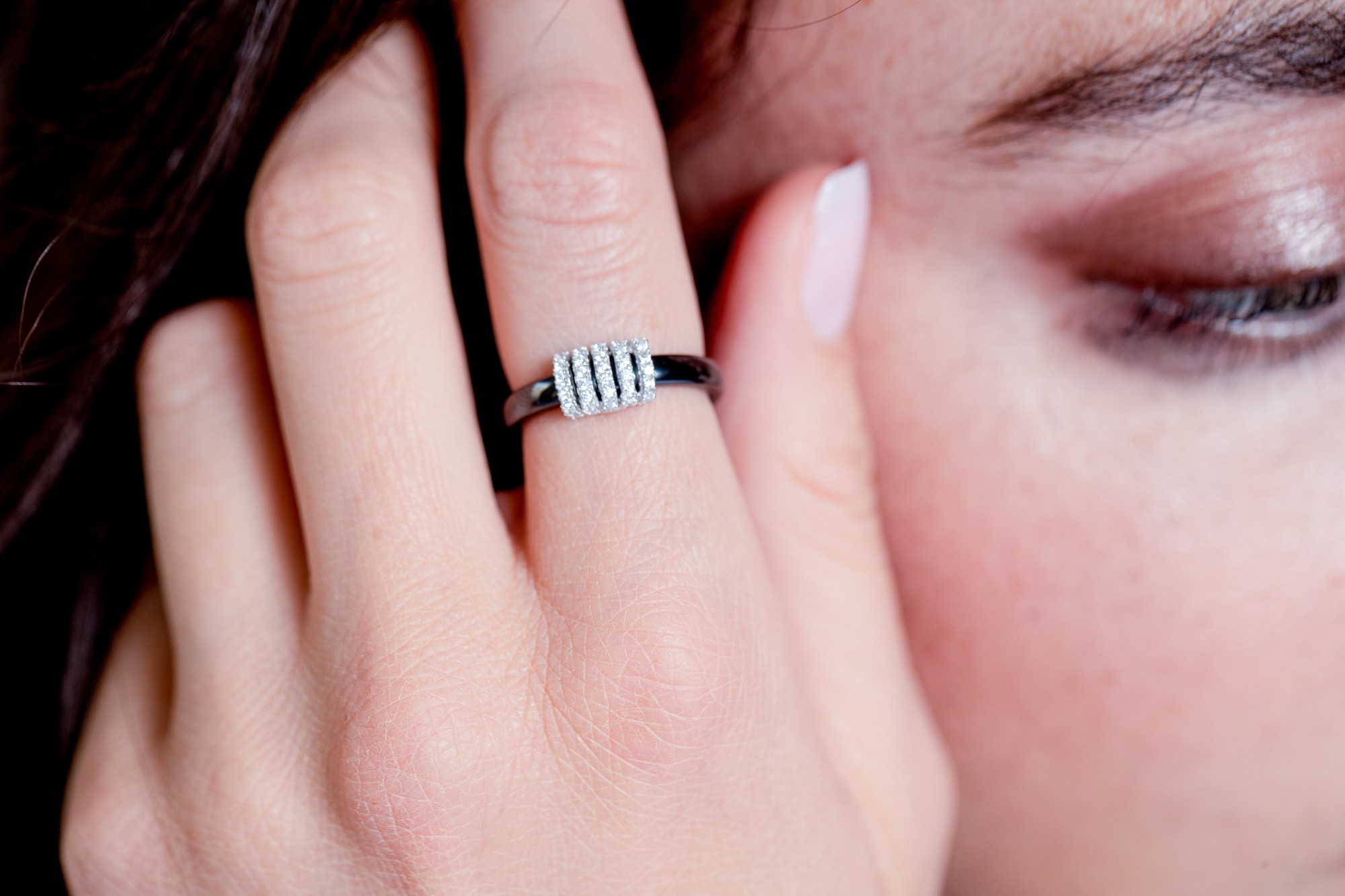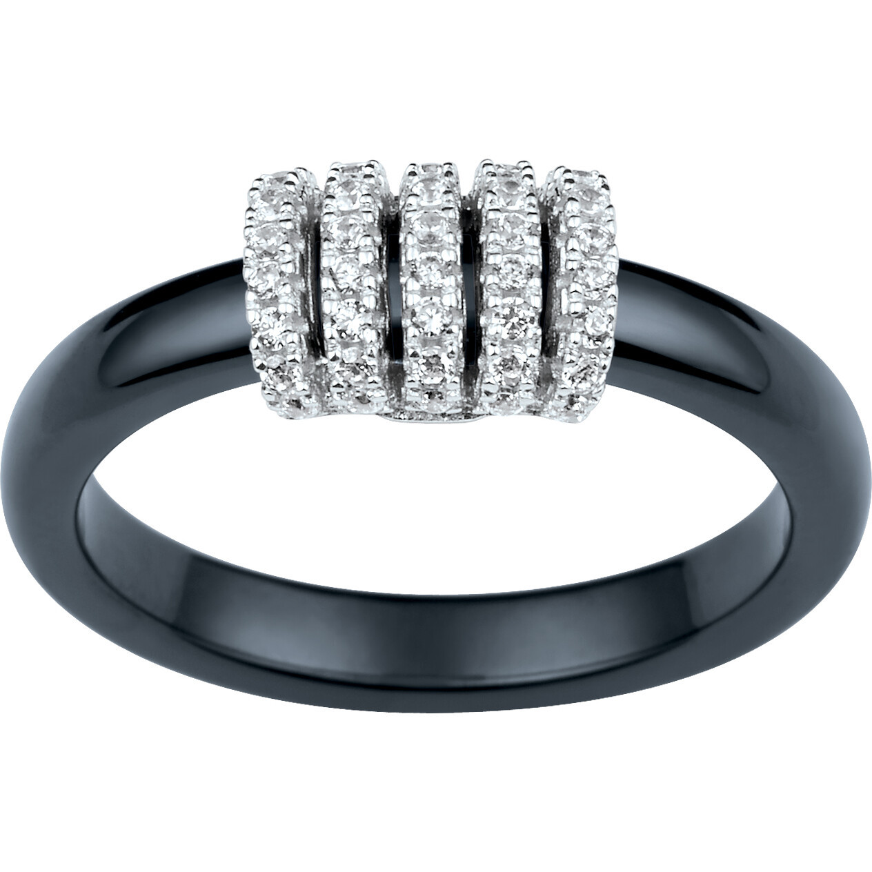Alliant sobriété et éclat, la bague Raku révèle une allure contemporaine d’une grande finesse. Son anneau en céramique noire lisse met en valeur un motif central composé de cinq anneaux d’argent pavés d’oxydes de zirconium, pour un effet graphique et scintillant.