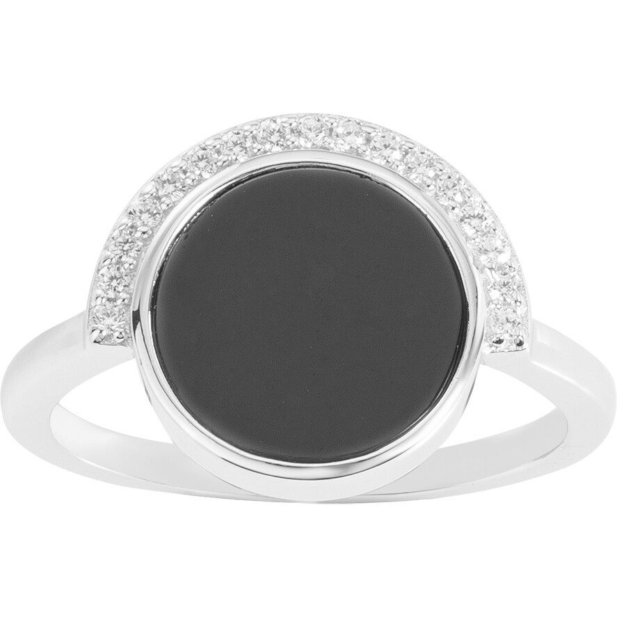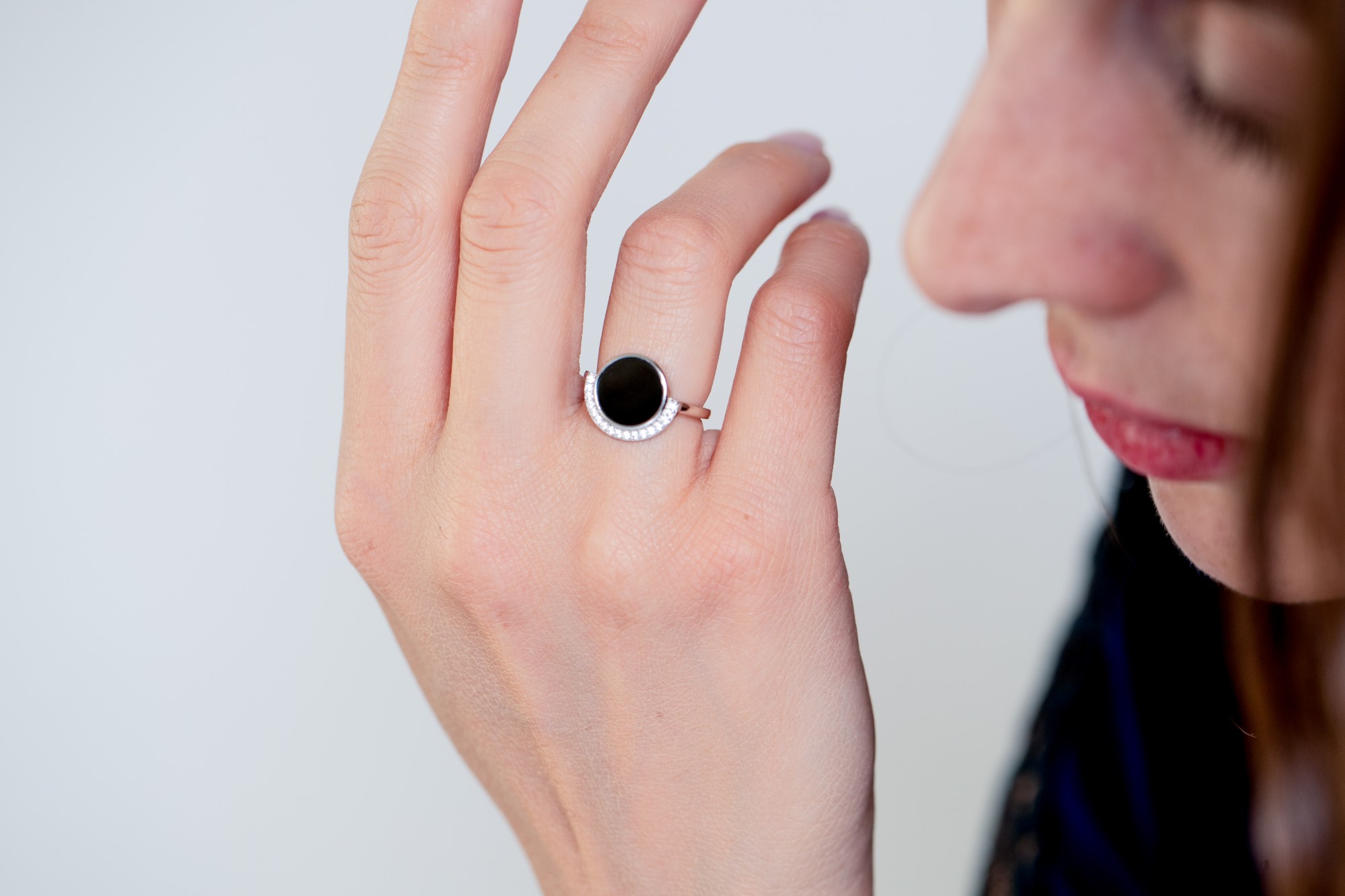La bague Sable séduit par sa pureté graphique et son contraste saisissant. Son disque central en céramique noire lisse est mis en valeur par un cerclage d’argent délicatement rehaussé d’un arc pavé d’oxydes de zirconium, comme une lueur venant caresser la surface sombre de la céramique.