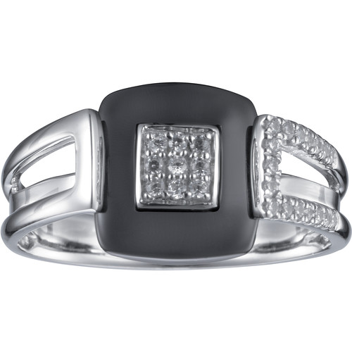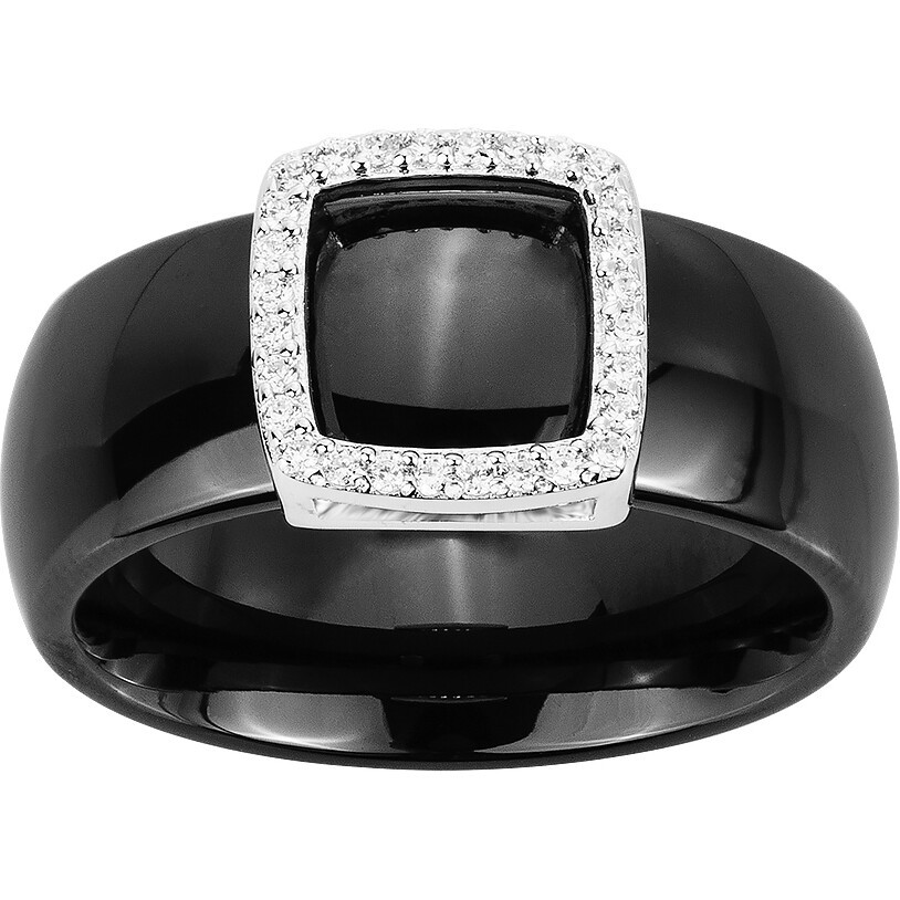 Moderne et lumineuse, la bague Étincelle unit la profondeur de la céramique noire lisse à la brillance éclatante d’un carré d’argent serti d’oxydes de zirconium. Son anneau large, au galbe élégant, met en valeur la pureté de ses lignes et la symétrie parfaite de son motif central.