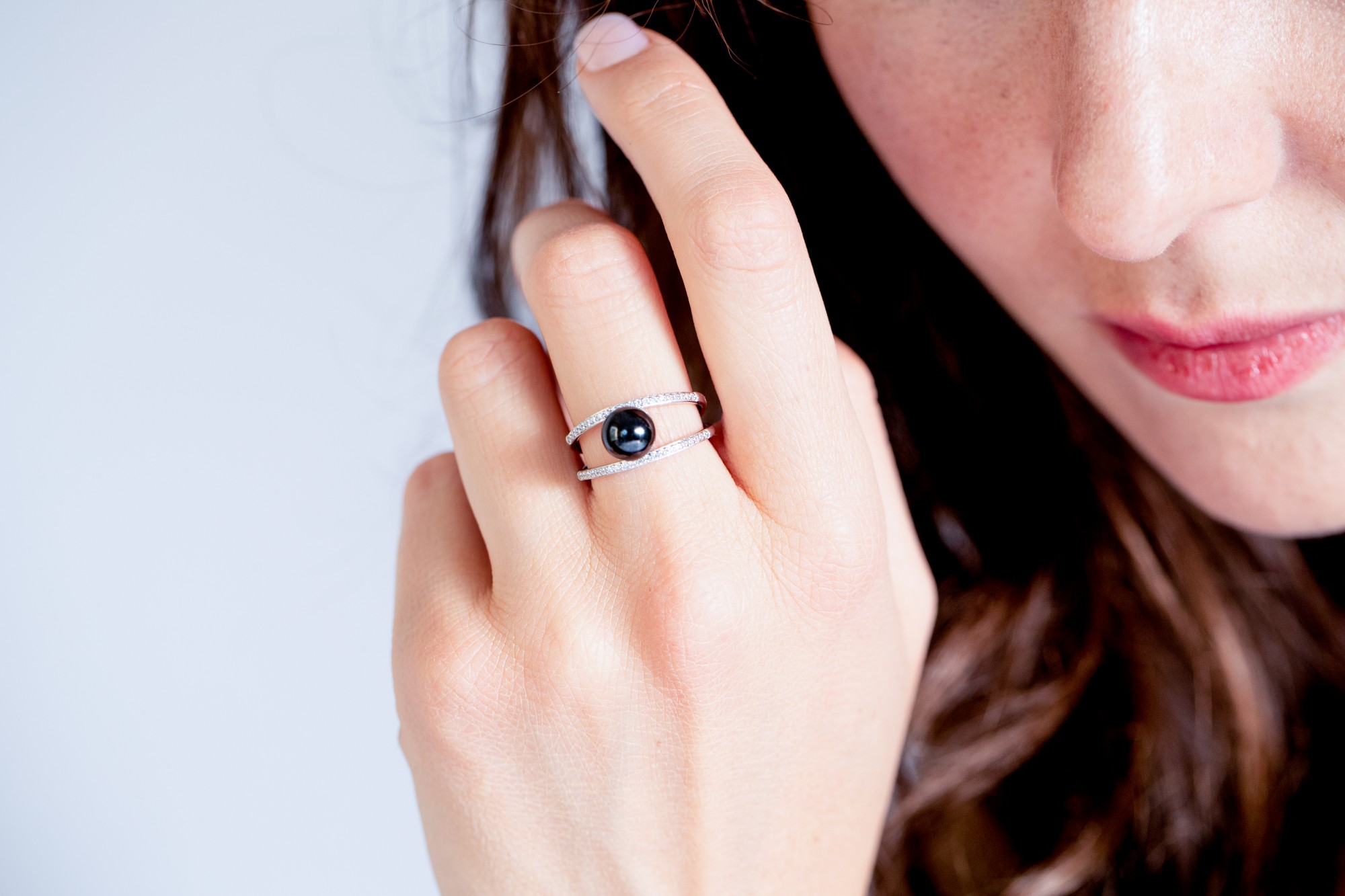 La bague Symétrie incarne l’équilibre parfait entre modernité et douceur. En son centre, une sphère en céramique noire lisse semble flotter entre deux arcs en argent 925 rhodié finement pavés d’oxydes de zirconium.