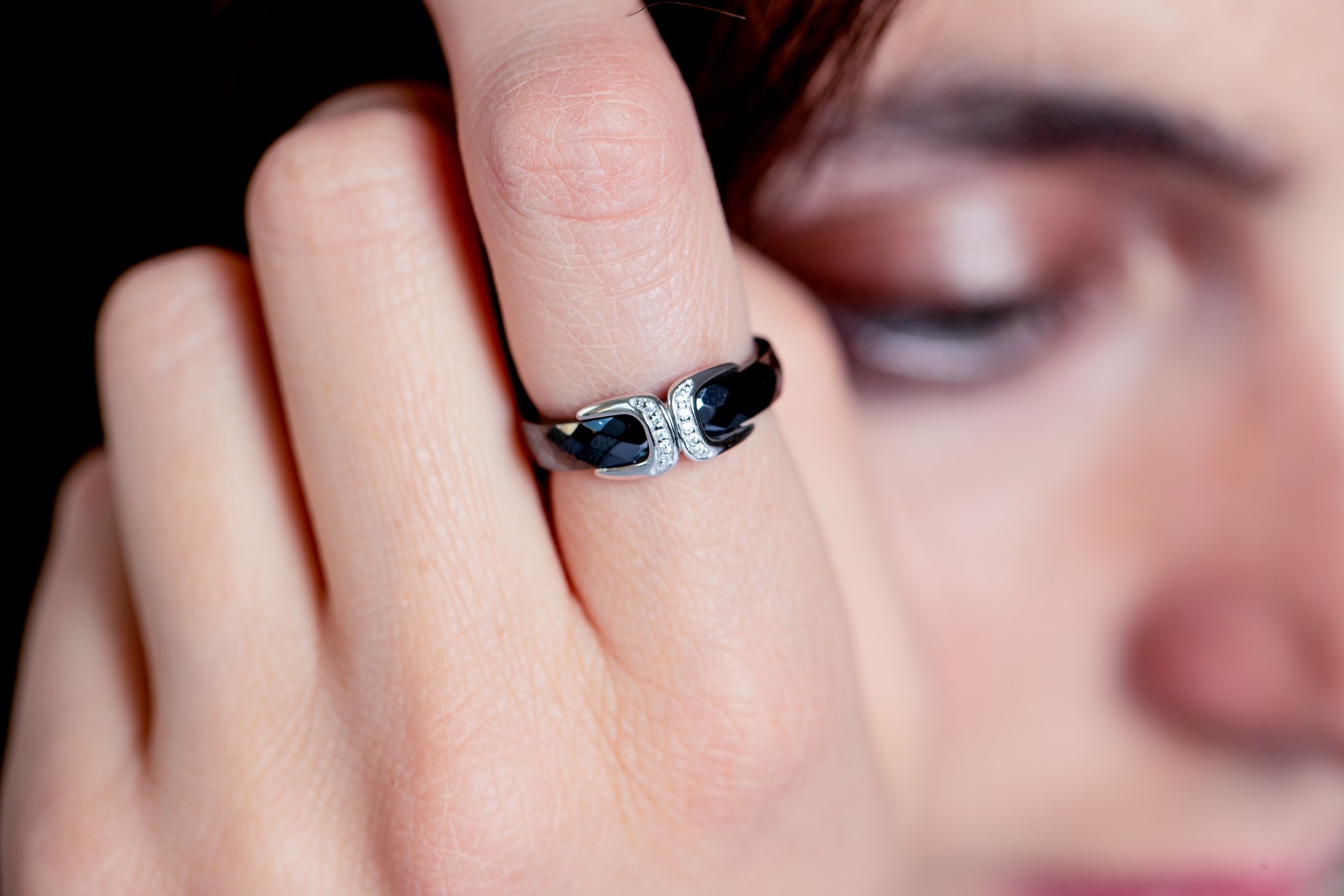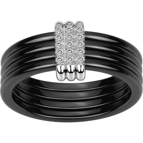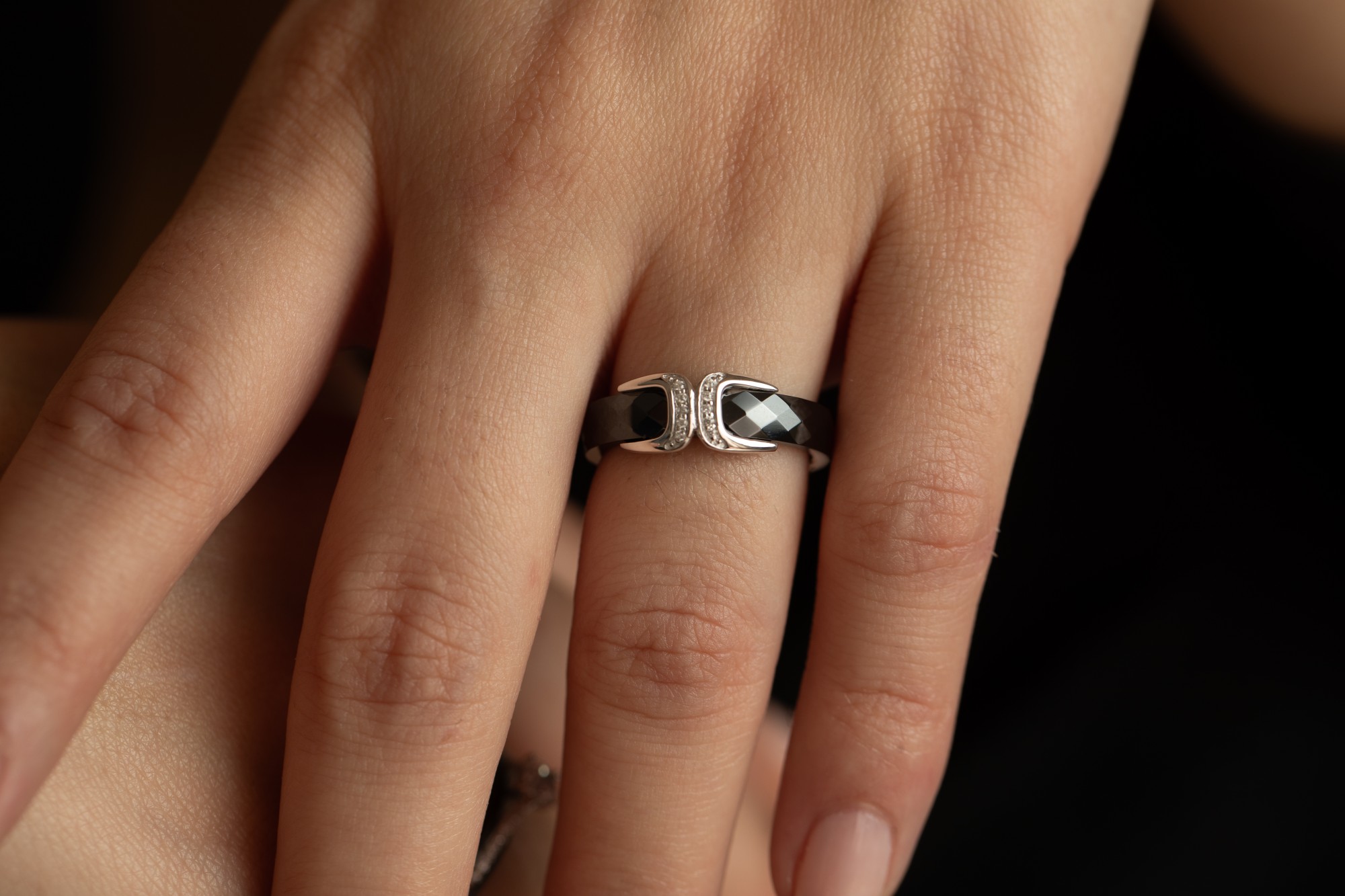 Alliance subtile entre design et lumière, la bague Céladon attire le regard par son jeu de contrastes. La céramique noire à relief apporte profondeur et caractère, tandis que l’argent 925 rhodié et ses oxydes de zirconium étincelants illuminent la main d’un éclat raffiné.