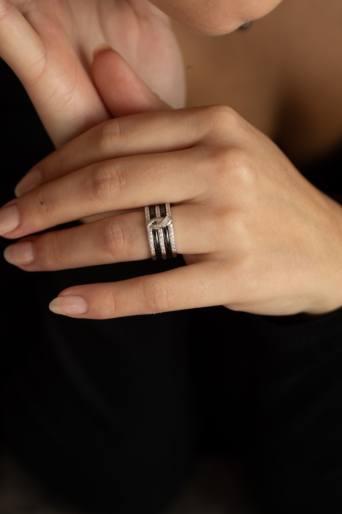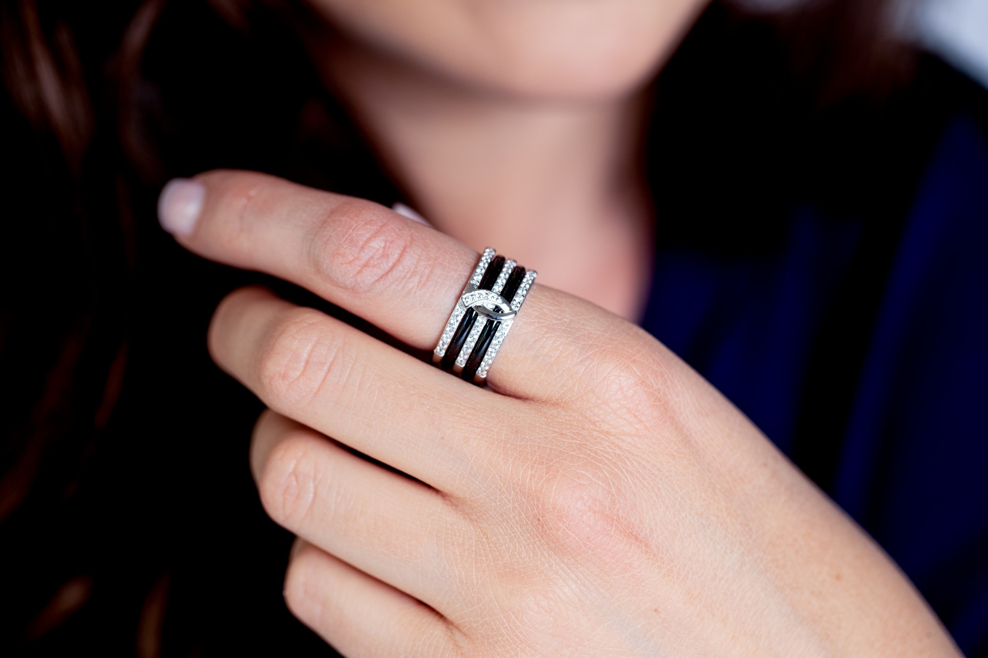 Audacieuse et lumineuse, la bague Essence joue sur le contraste entre la céramique noire lisse et l’éclat pur de l’argent 925 rhodié. Ses rangs rythmés par un pavage d’oxydes de zirconium créent un équilibre parfait entre intensité et brillance.