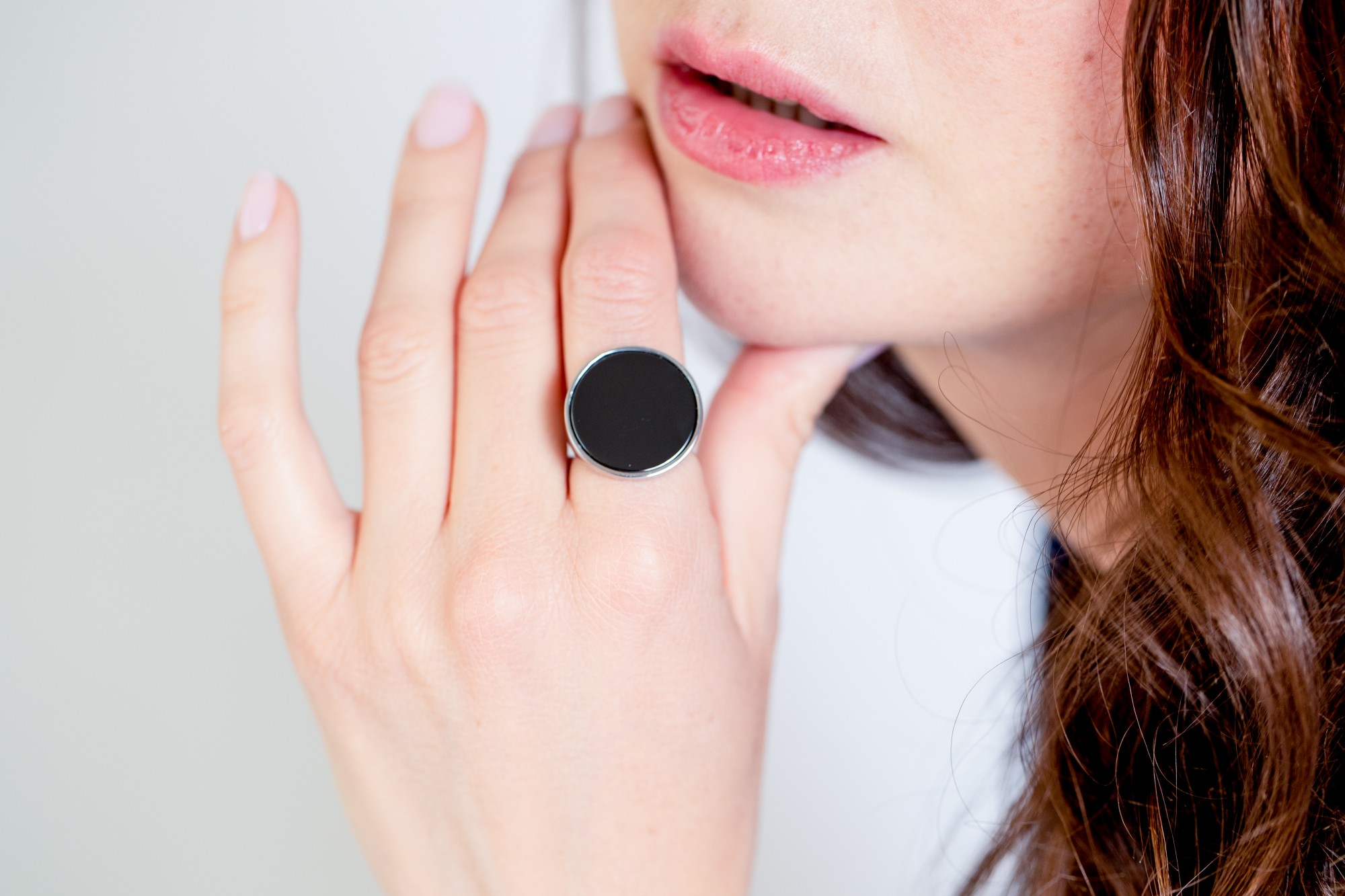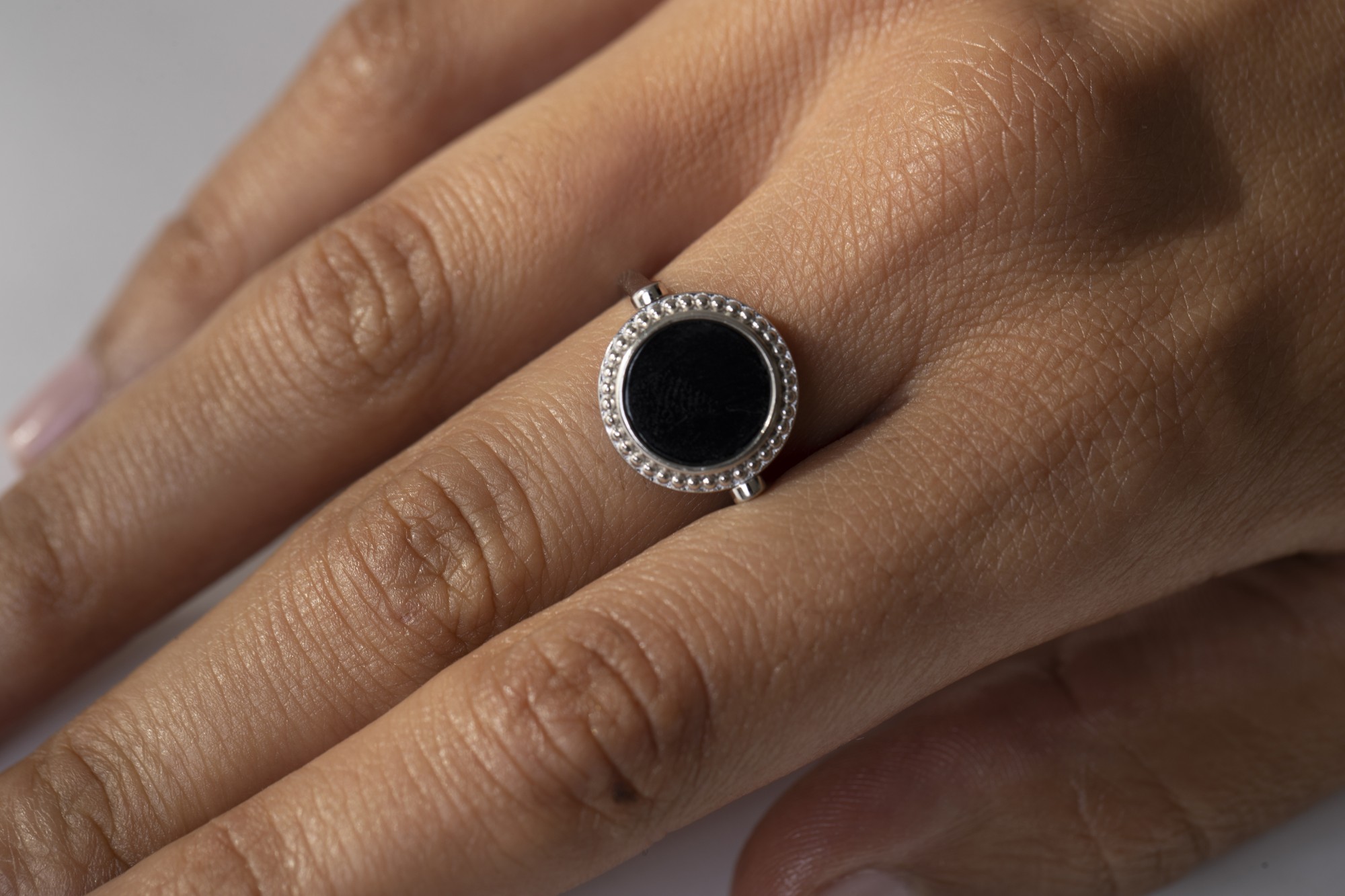 La bague Satsuma séduit par la force tranquille de son design. Une large pastille de céramique noire, lisse et profonde, s’impose au centre, encadrée d’un délicat cercle d’oxydes de zirconium qui capte chaque éclat de lumière. L’argent 925 rhodié vient sublimer l’ensemble, offrant à cette création Ceranity une allure à la fois pure et affirmée.