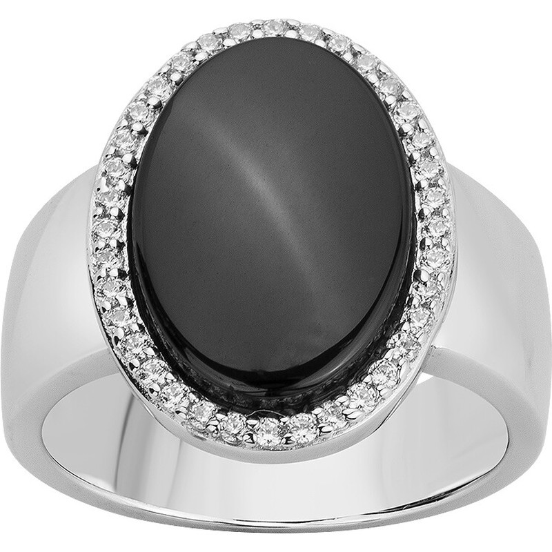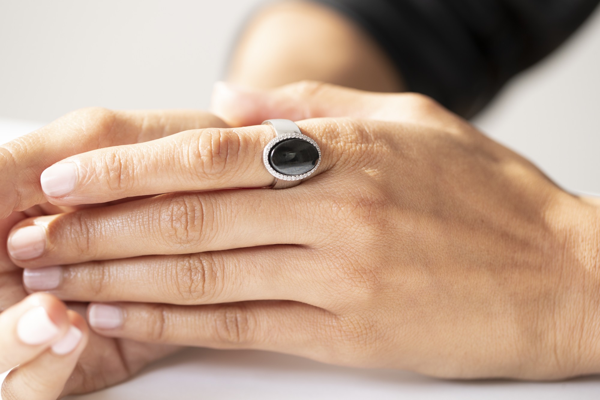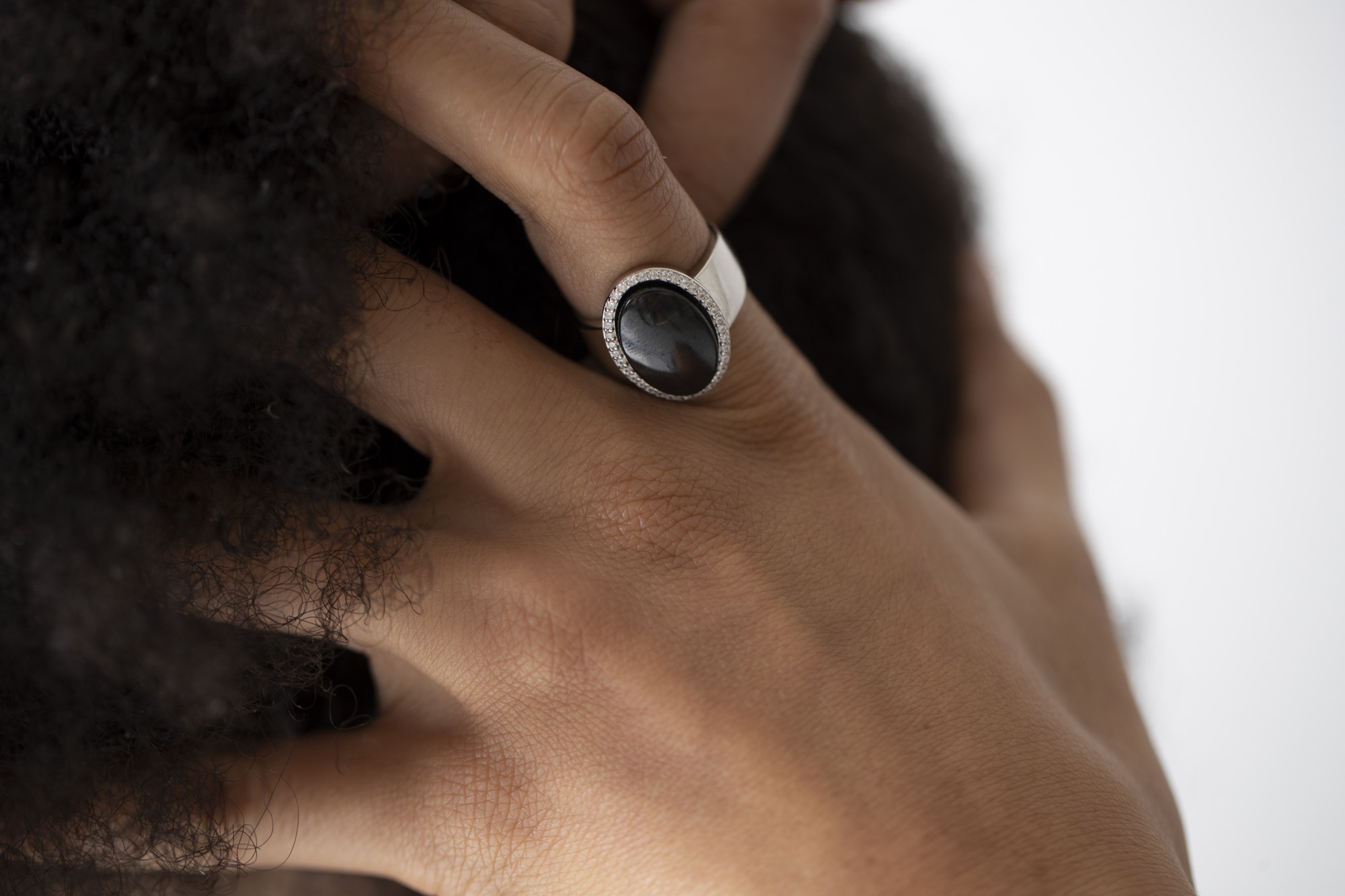 La bague Cristallin séduit par son équilibre et la douceur de ses lignes. En son centre, une ovale de céramique noire parfaitement lisse attire le regard par son éclat profond et sa texture raffinée. Son contour d’oxydes de zirconium illumine la forme avec justesse, créant un contraste délicat entre intensité et brillance.