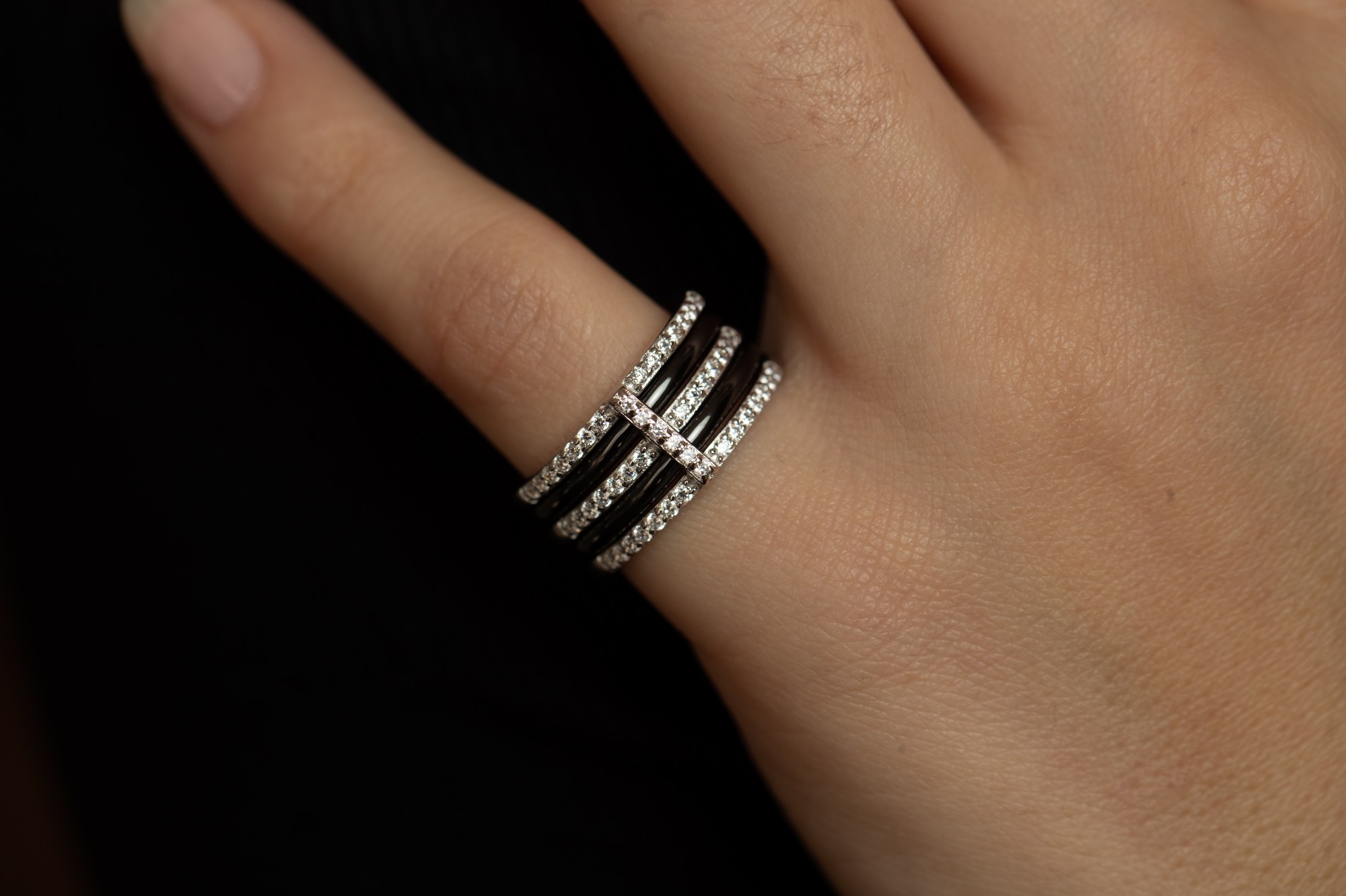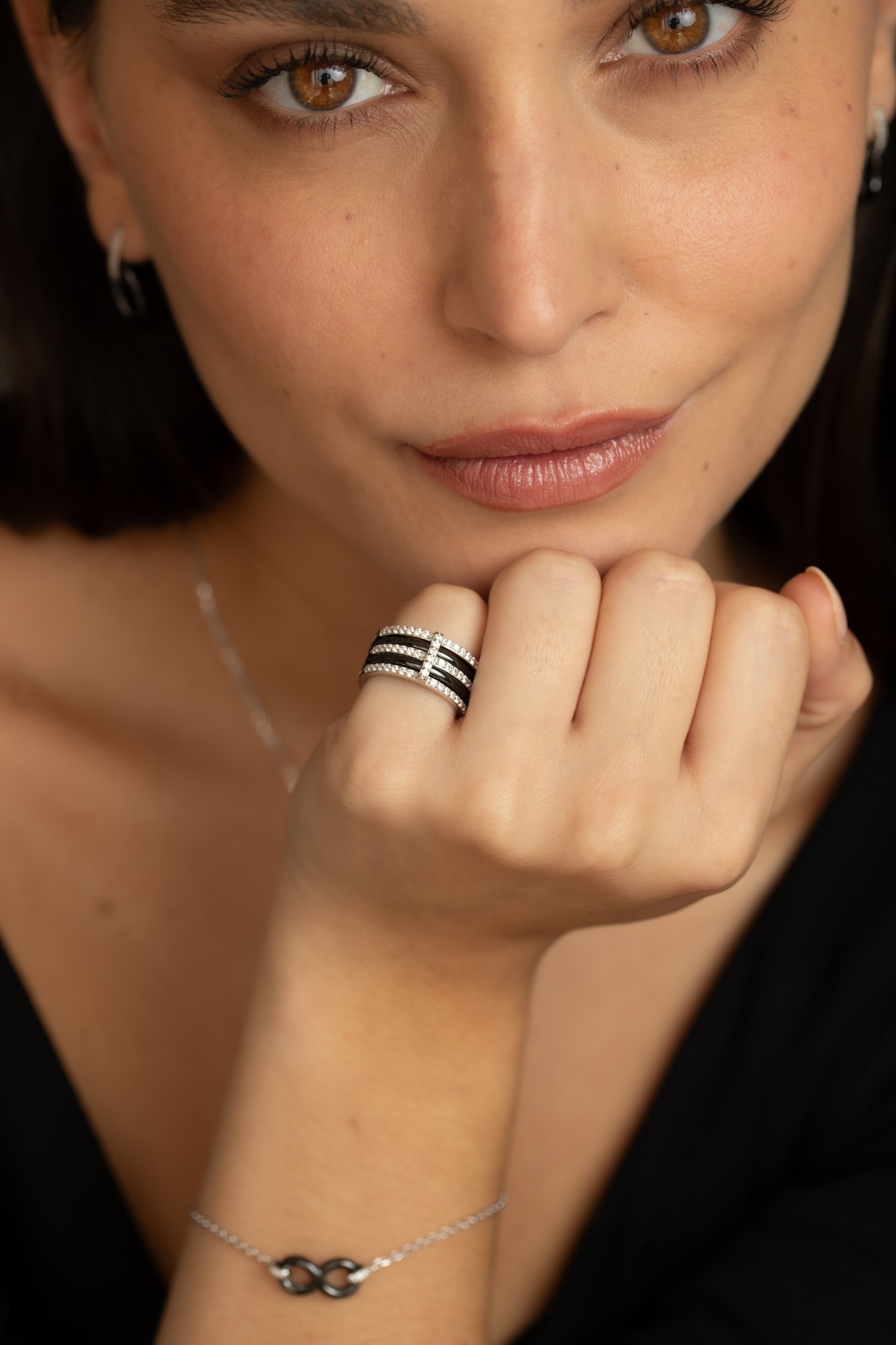 La bague Opale séduit par son allure architecturale et son jeu d’équilibre parfait entre matière et lumière. Deux anneaux en céramique noire, lisses et profonds, s’insèrent dans une monture en argent 925 rhodié sertie d’oxydes de zirconium scintillants.