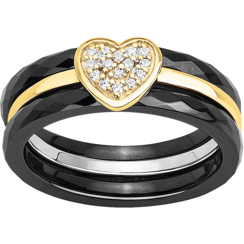 Trois anneaux s’unissent en un équilibre parfait : la profondeur de la céramique noire à relief contraste avec l’éclat de l’argent 925 rhodié, sublimé d’un cœur lumineux serti d’oxydes de zirconium.
