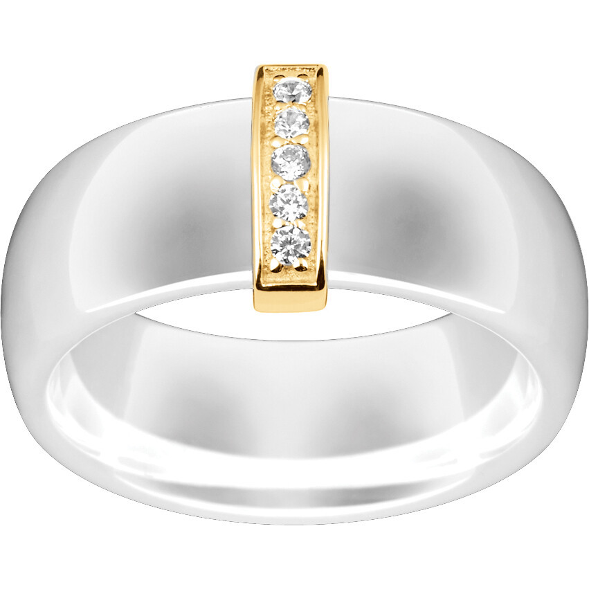 Sa large monture en céramique blanche incarne la pureté et la sérénité, tandis qu’un éclat vertical en plaqué or 18 carats serti d’oxydes de zirconium symbolise la lumière qui répare et sublime.