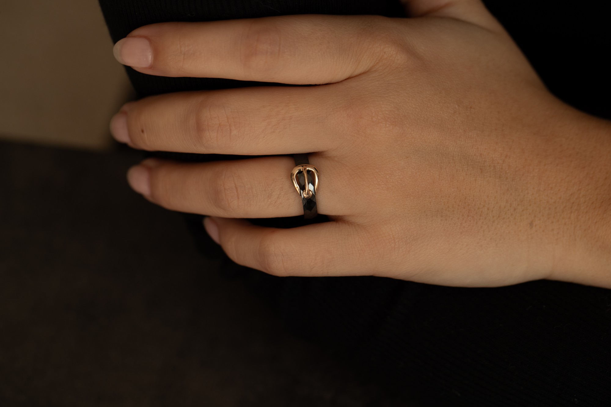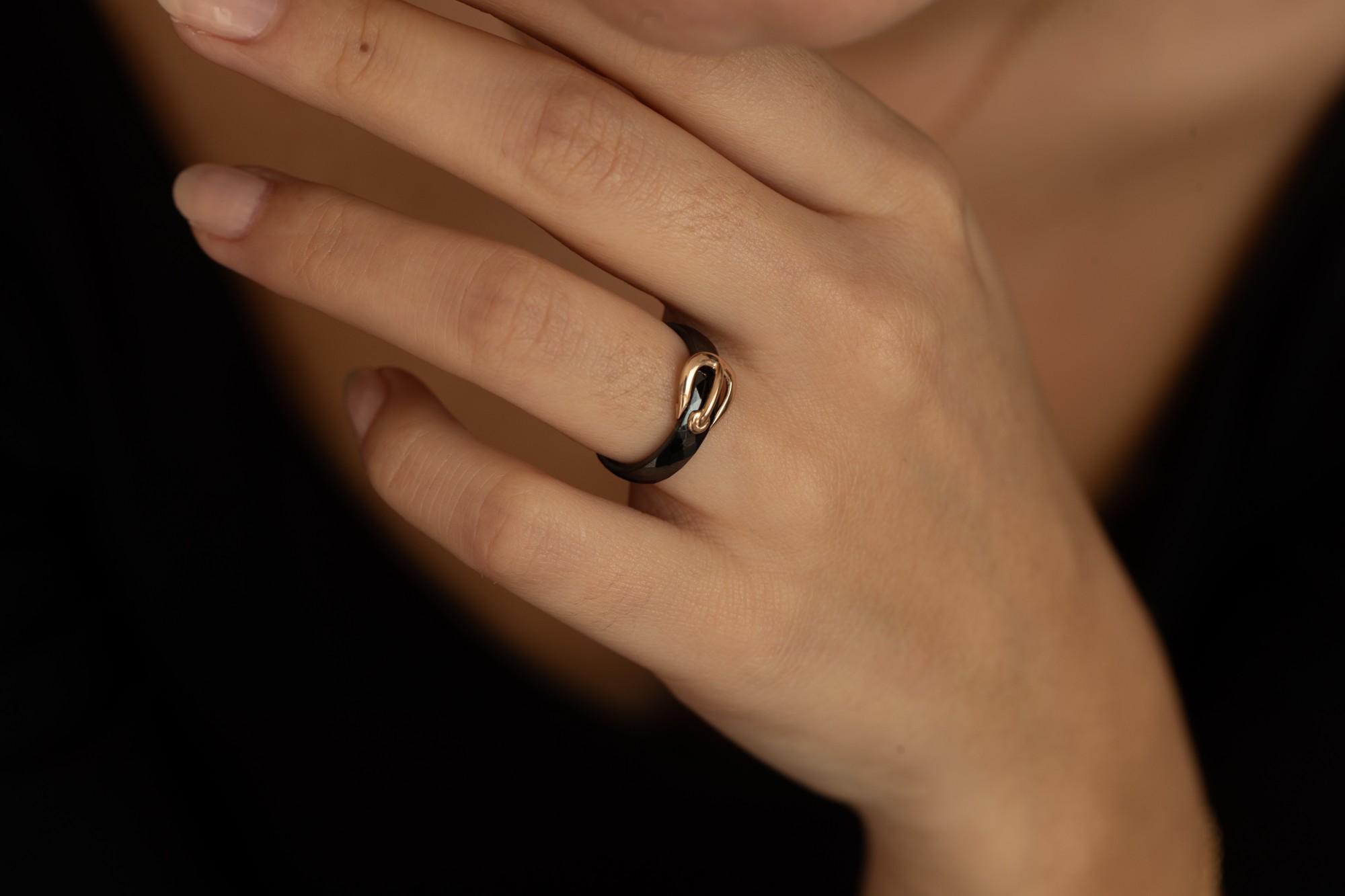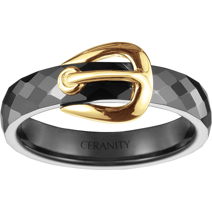 Son anneau en céramique noire à relief, subtilement facetté, reflète la lumière avec intensité. En contraste, le motif en plaqué or 18 carats vient se poser comme un accent solaire, épousant la courbe du doigt avec fluidité.