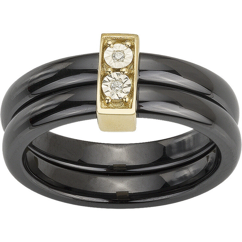 Deux anneaux en céramique noire se rejoignent autour d’un motif rectangulaire en plaqué or 18 carats, serti de deux oxydes de zirconium qui captent la lumière comme un éclat suspendu.