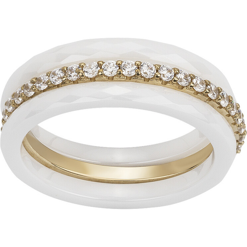 La bague Dentelle mêle la douceur lumineuse de la céramique blanche à relief à l’éclat chaud du plaqué or 18 carats.