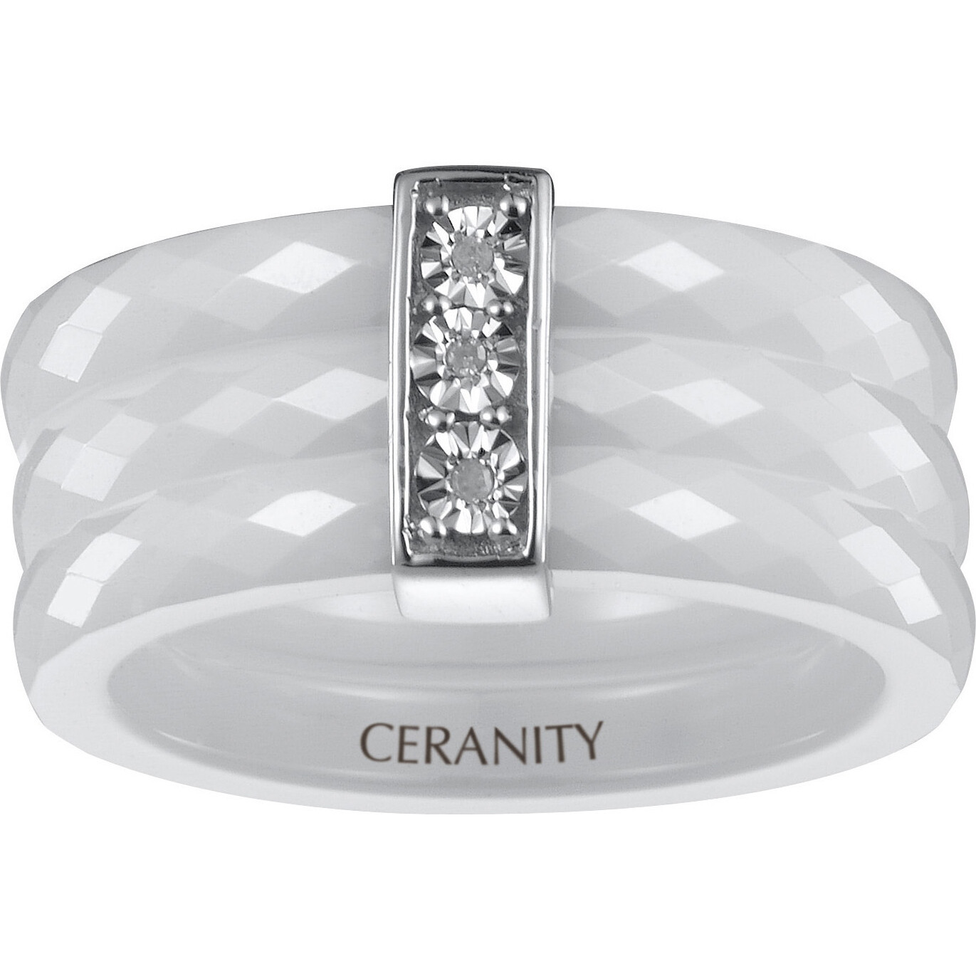 Composée de trois anneaux en céramique blanche à relief, rehaussés d’un motif vertical en argent 925 rhodié serti de trois oxydes de zirconium, elle capte la lumière avec élégance.