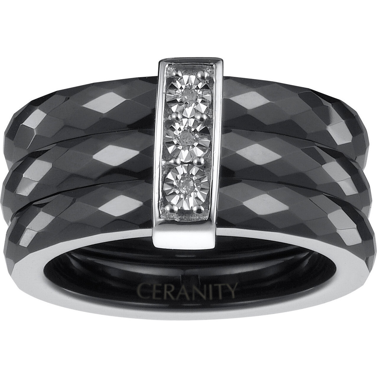 Ses trois anneaux en céramique noire à relief évoquent la rigueur des colonnes antiques, tandis qu’un motif vertical en argent 925 rhodié, serti de trois oxydes de zirconium, illumine la composition.