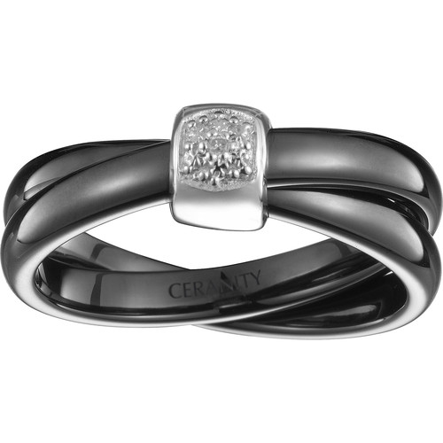 Deux anneaux en céramique noire, d’un éclat profond, s’unissent autour d’un motif carré en argent 925 rhodié, subtilement pavé d’oxydes de zirconium.
