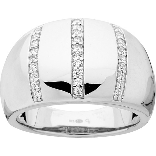 Sa surface lisse et brillante met en valeur un serti rectangulaire d’oxydes de zirconium, sublimé par une monture en argent 925 rhodié.