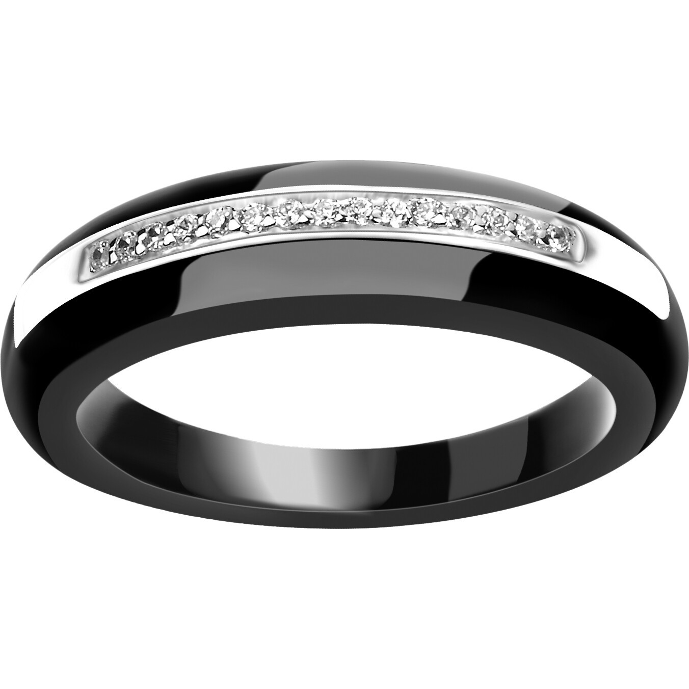 Son anneau en céramique noire à la brillance profonde est sublimé par une ligne d’argent 925 rhodié, finement sertie d’oxydes de zirconium.