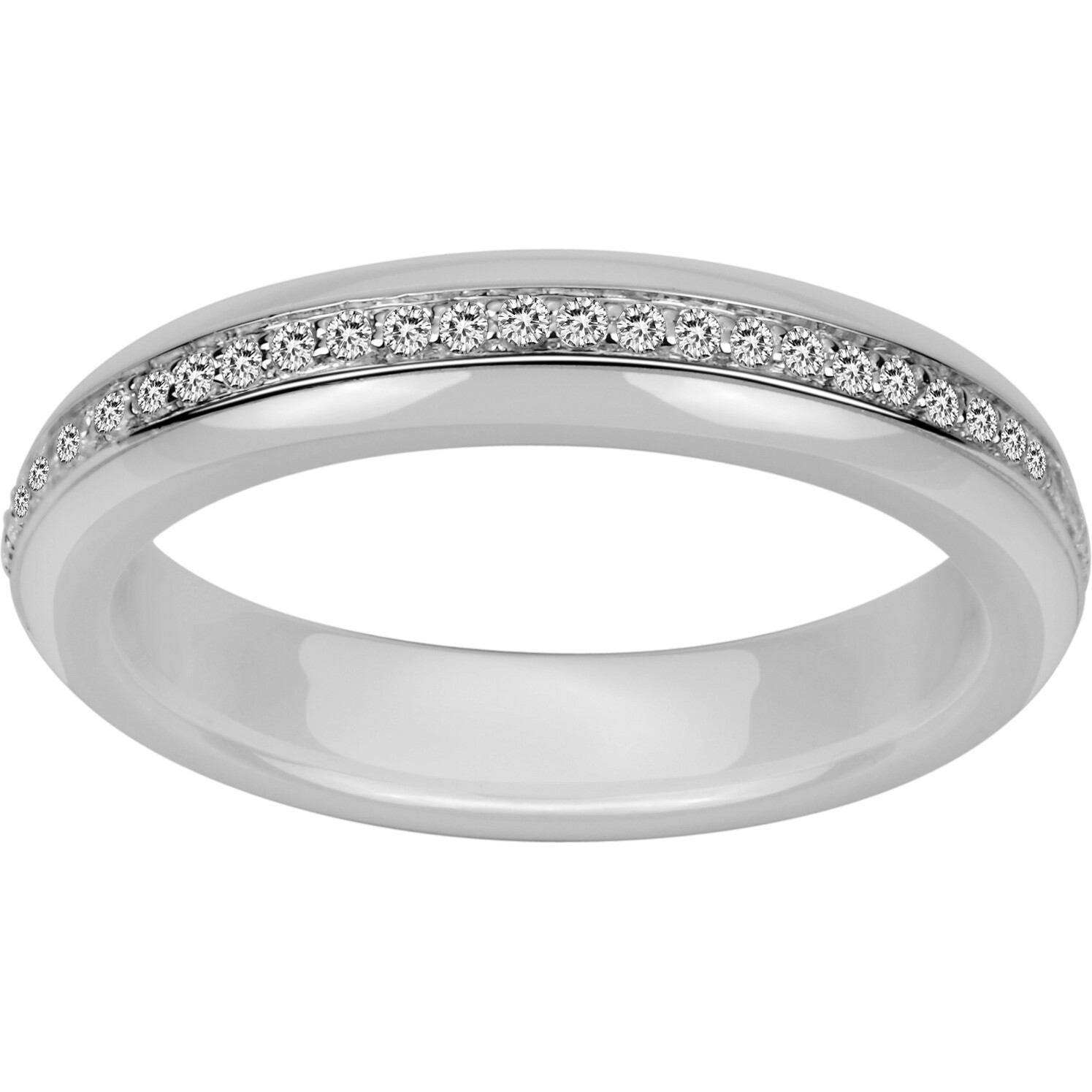 Son anneau en céramique blanche, à la brillance soyeuse, est sublimé d’un liseré d’argent 925 rhodié serti d’oxydes de zirconium scintillants.