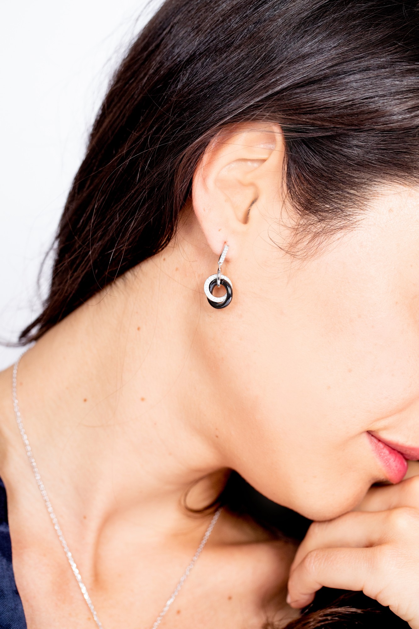 Les boucles Émail jouent sur les contrastes et les volumes, mêlant la douceur de la céramique noire à la brillance de l’argent 925 rhodié.