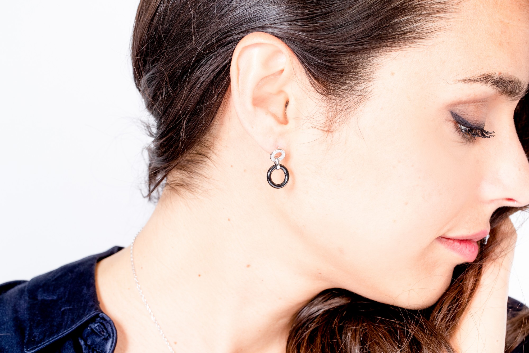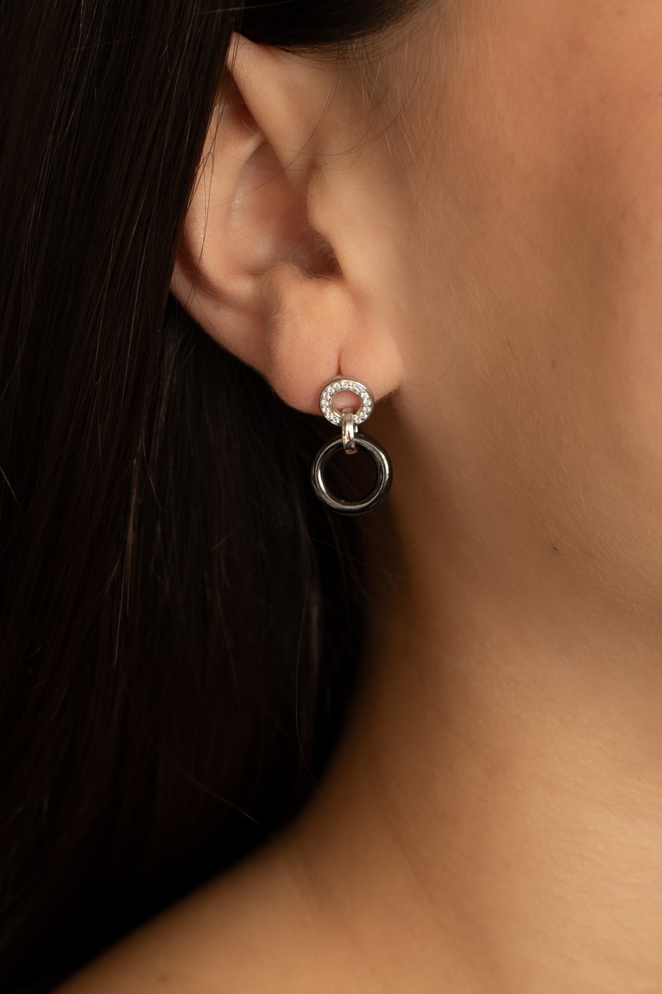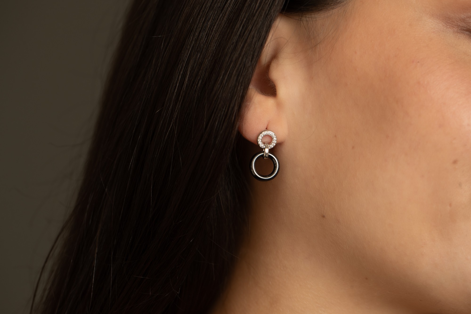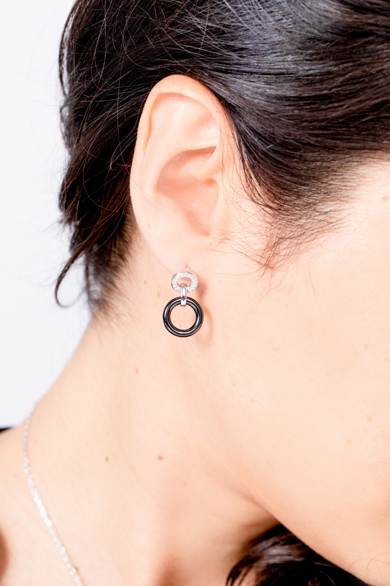 L’anneau de céramique noire s’accorde à la pureté éclatante de l’argent 925 rhodié, rehaussé d’un cercle serti d’oxydes de zirconium.