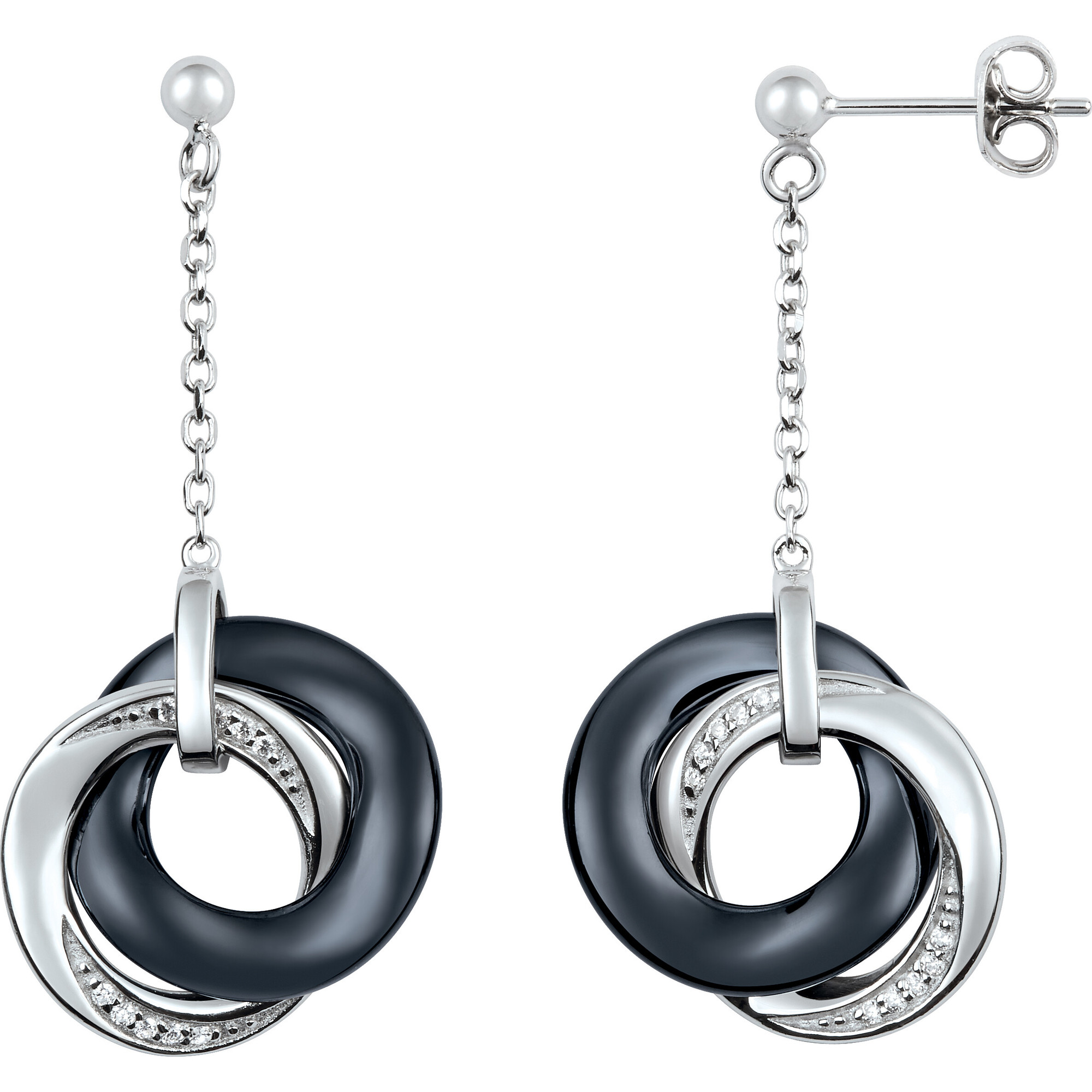 Trois anneaux s’entrelacent avec fluidité — la céramique noire lisse, l’argent 925 rhodié et les oxydes de zirconium se répondent dans un jeu d’éclats et de contrastes subtils.