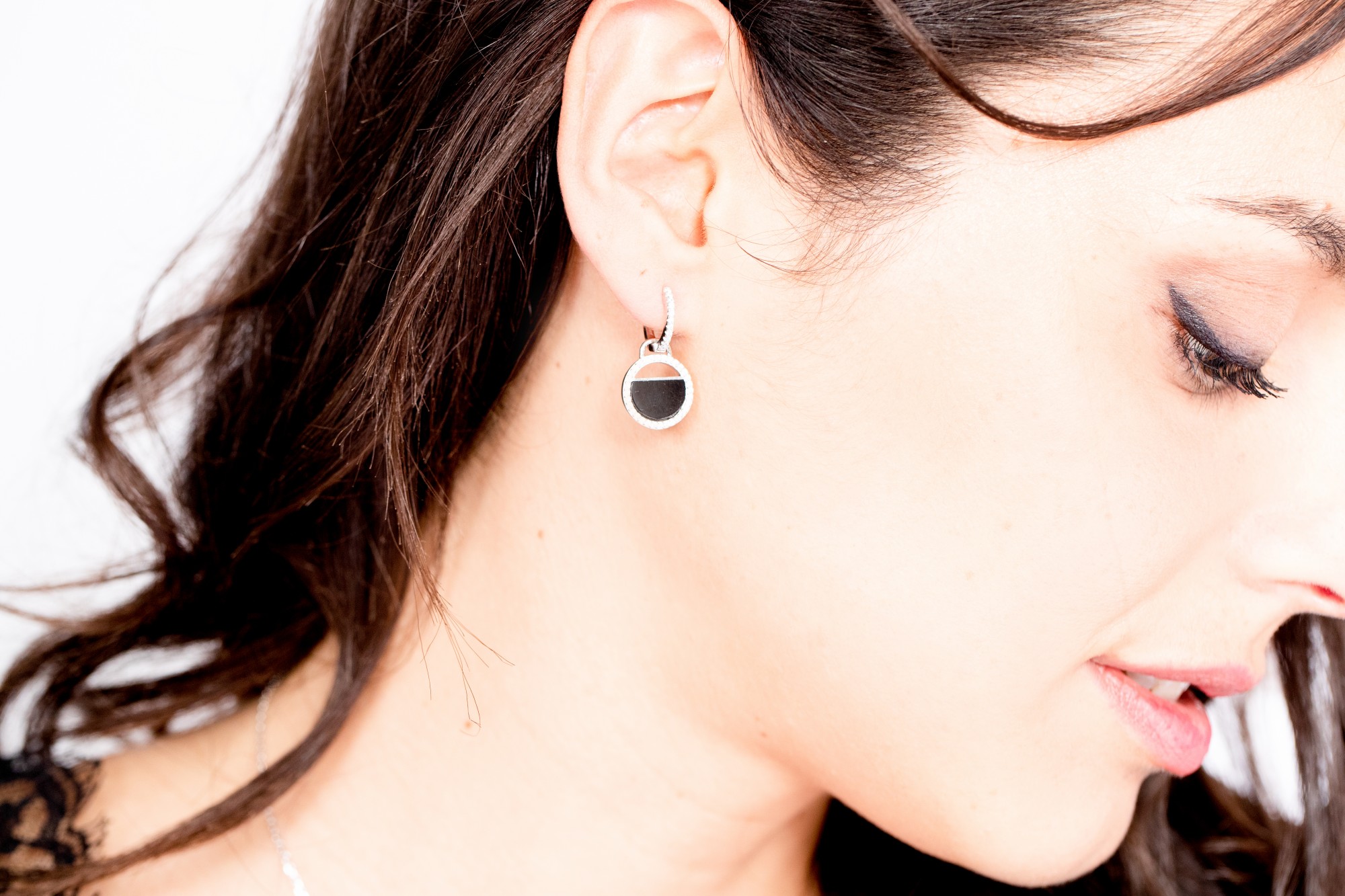 La céramique noire, découpée en demi-lune, s’inscrit au cœur d’un cercle lumineux pavé d’oxydes de zirconium. L’argent 925 rhodié vient souligner cette composition graphique et raffinée, offrant un éclat subtil à chaque mouvement.
