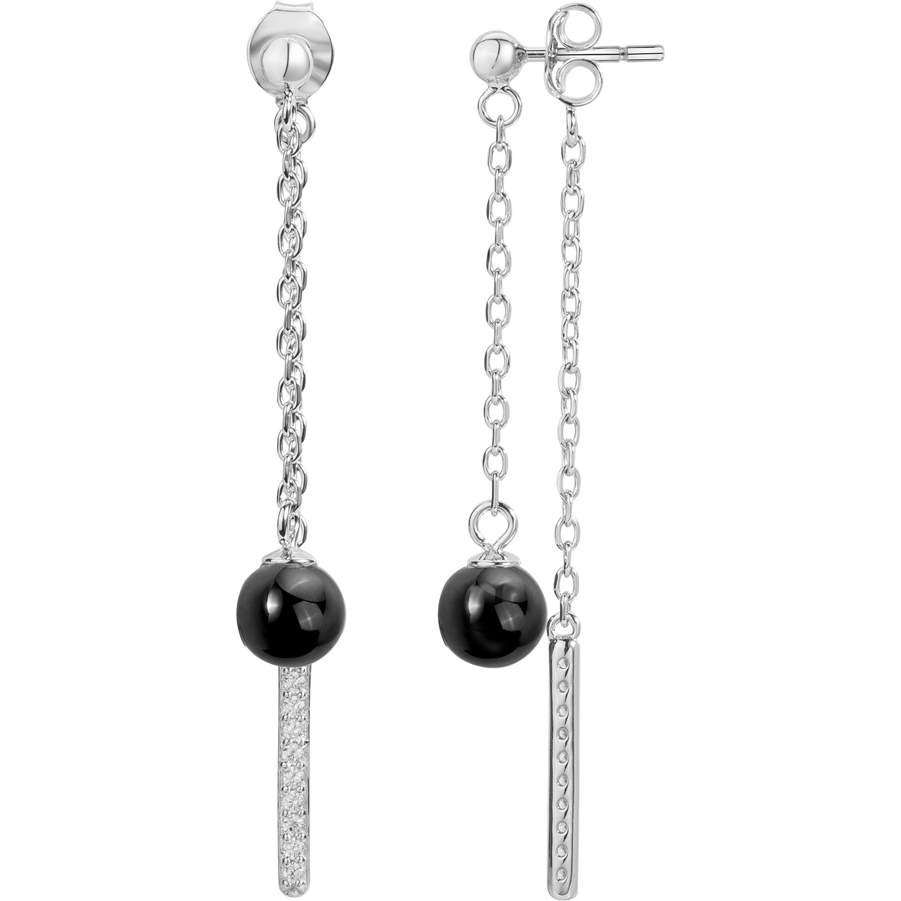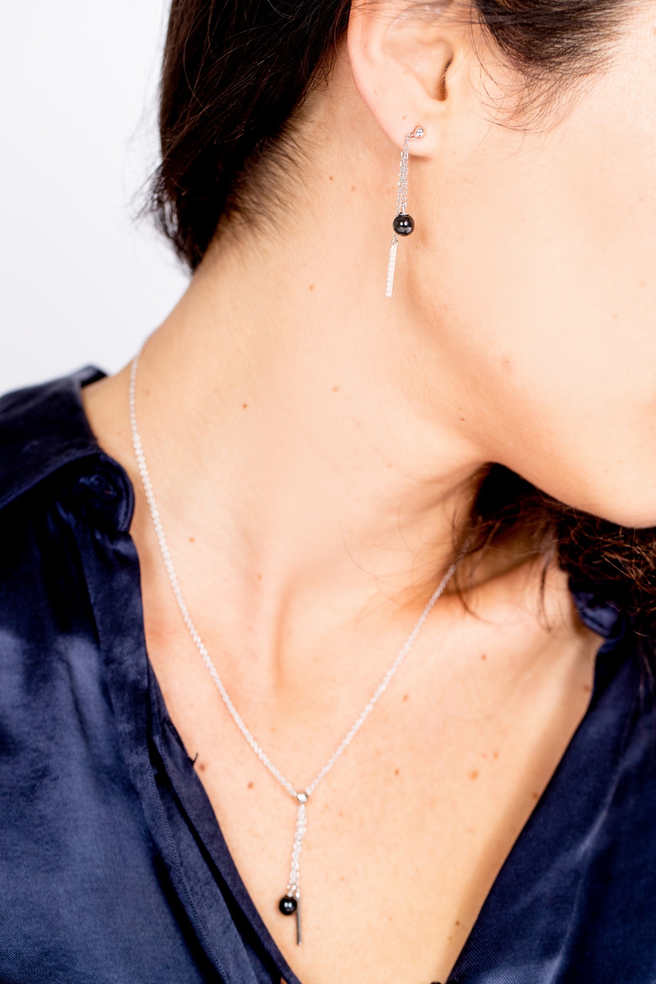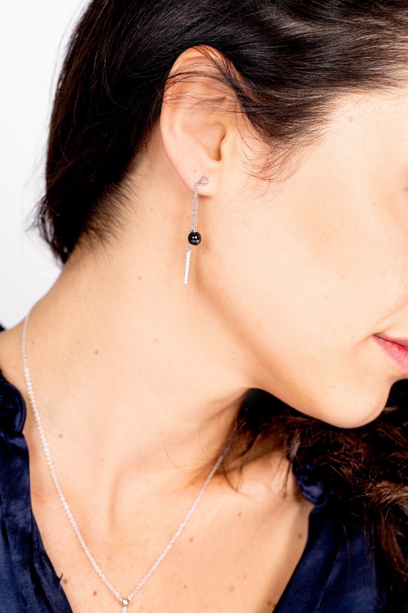 Leur design suspendu mêle la sobriété de la céramique noire à l’éclat raffiné de l’argent 925 rhodié, ponctué d’une tige pavée d’oxydes de zirconium. Élégantes et contemporaines, elles subliment chaque mouvement d’une lumière discrète, idéale pour un style moderne et raffiné.