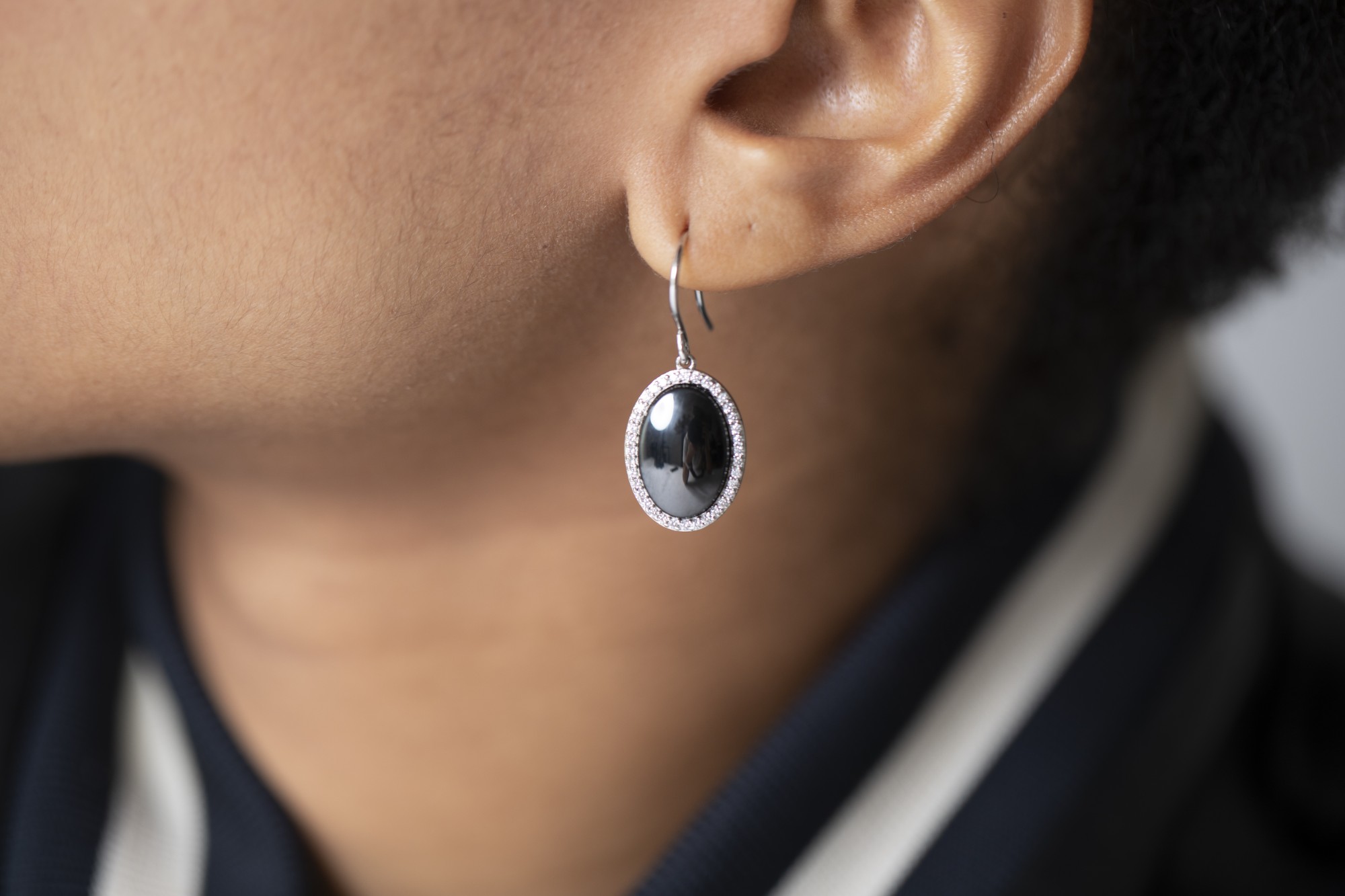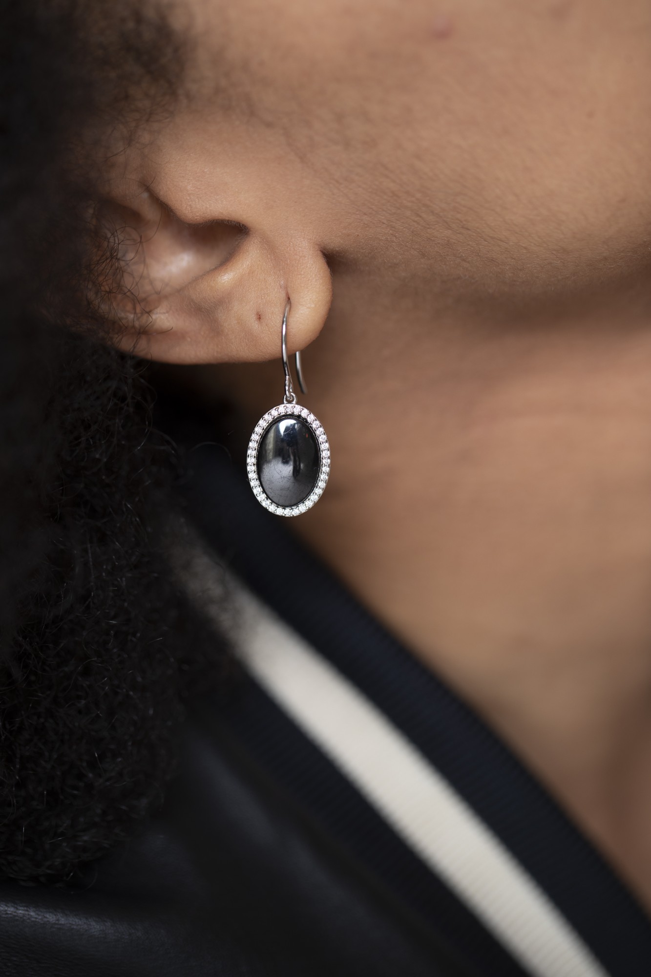 La céramique noire, lisse et profonde, est délicatement entourée d’un halo d’oxydes de zirconium sertis sur de l’argent 925 rhodié, évoquant une élégance à la fois classique et moderne.