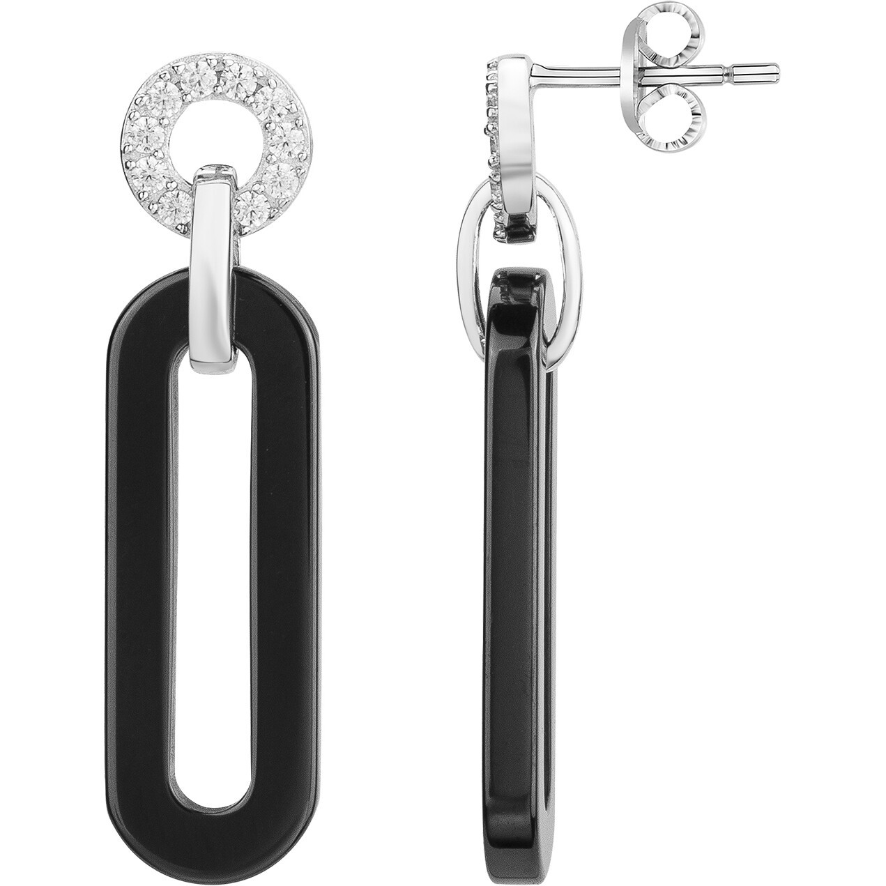 Leur design allongé associe la brillance de la céramique noire à la lumière éclatante de l’argent 925 rhodié, ponctué d’un cercle scintillant d’oxydes de zirconium.