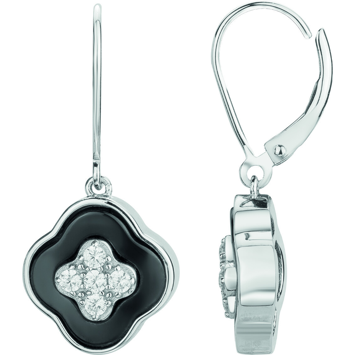 Leur motif trèfle en céramique noire encadre un éclat de lumière, sublimé par des oxydes de zirconium finement sertis sur une monture en argent 925 rhodié.