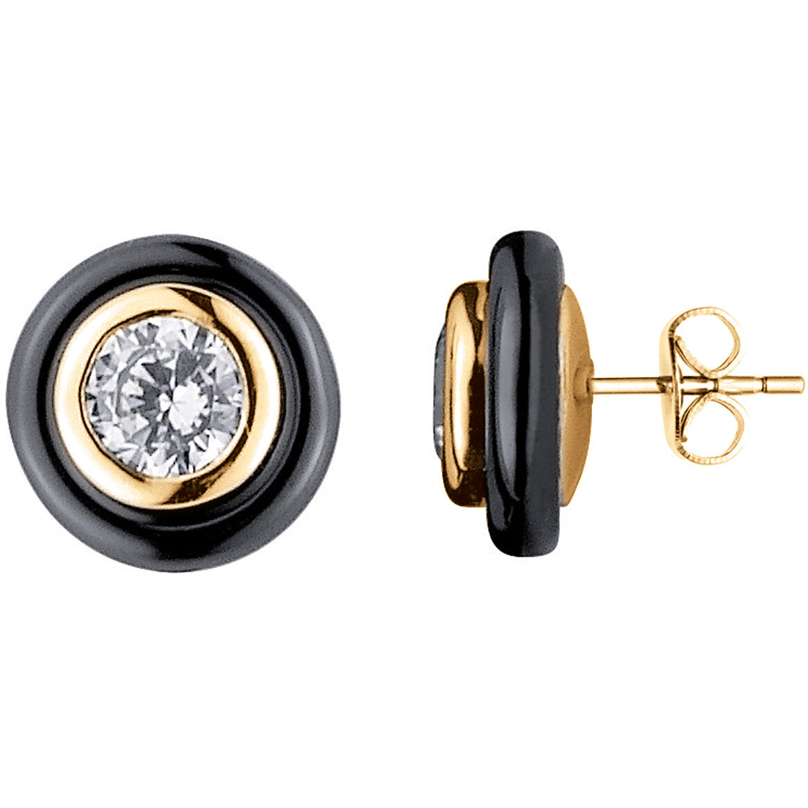 La céramique noire, intense et brillante, encercle un oxyde de zirconium éclatant, souligné par la brillance du plaqué or 18 carats.