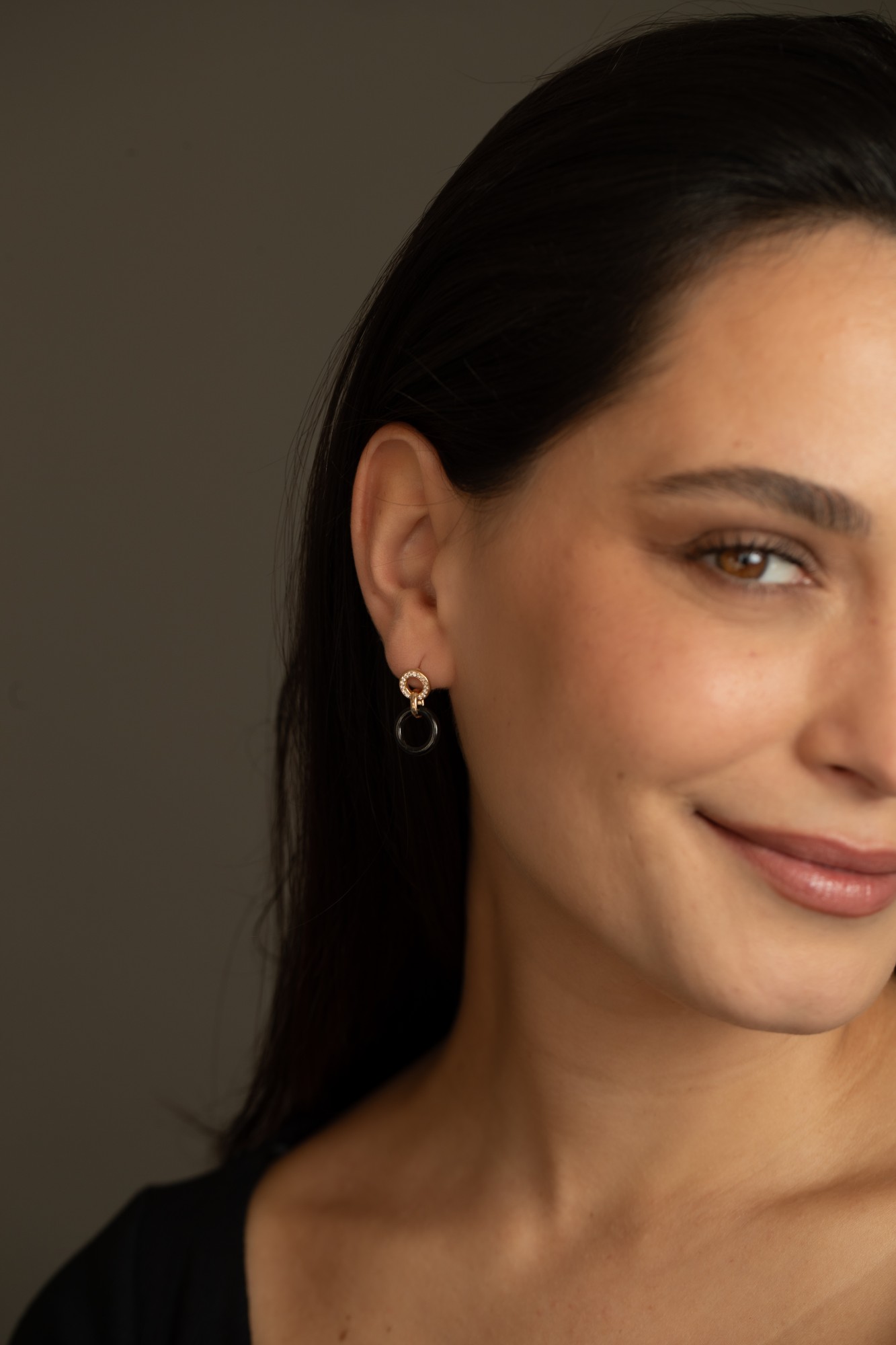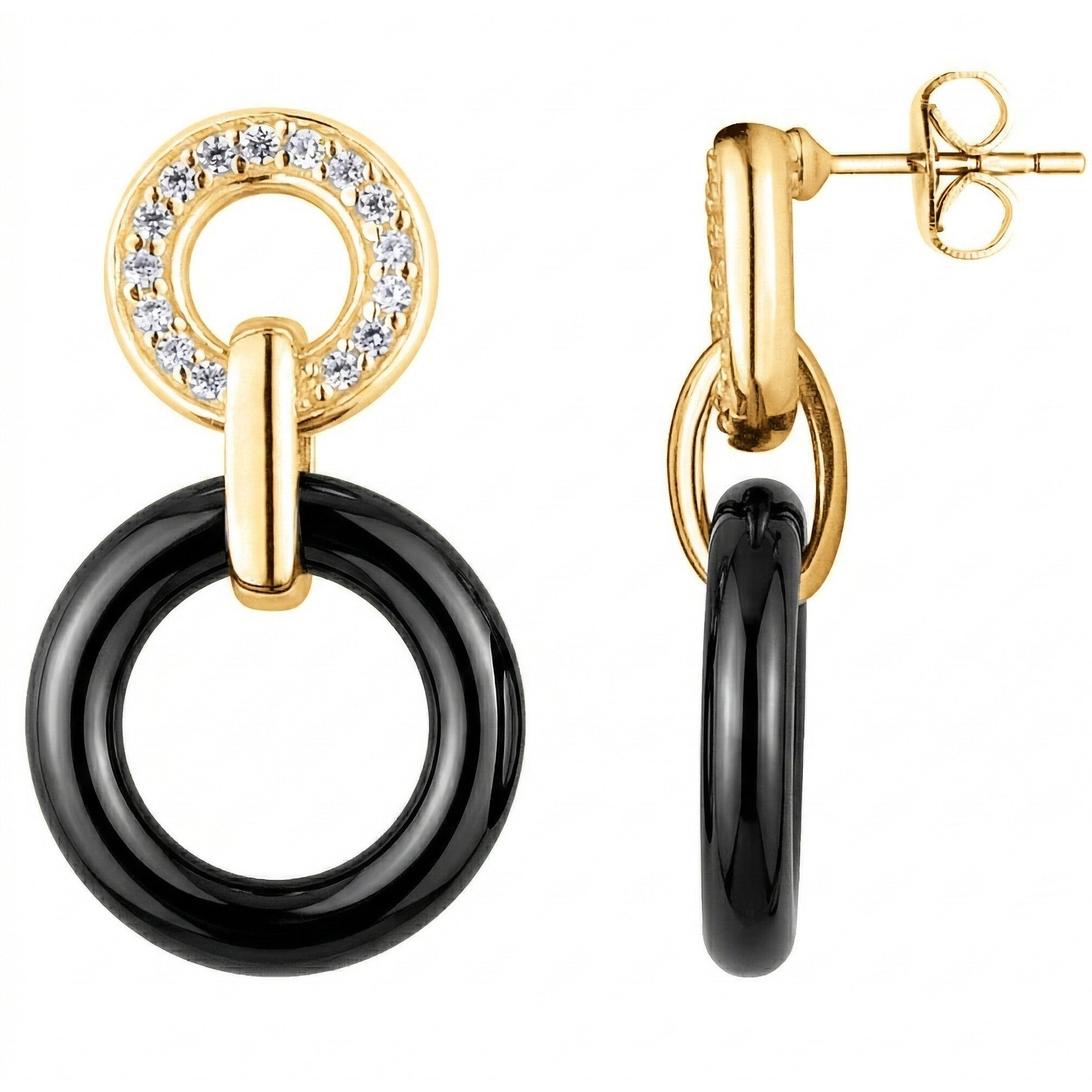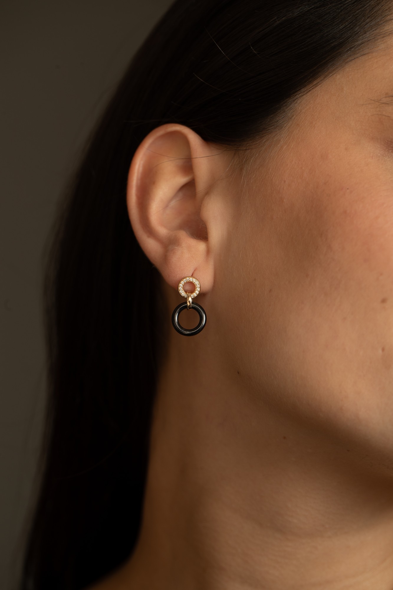 Les boucles Cretan jouent sur le contraste subtil entre la profondeur de la céramique noire et l’éclat solaire du plaqué or 18 carats.