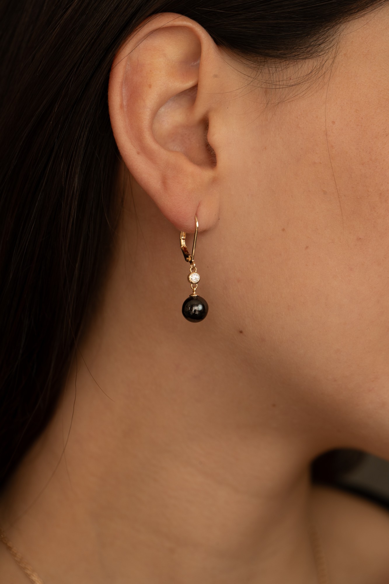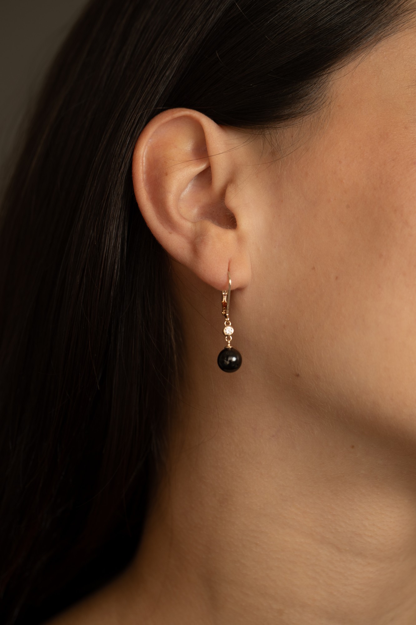 Leur perle sombre, lustrée et profonde, contraste avec la brillance du plaqué or 18 carats et le scintillement discret des oxydes de zirconium.