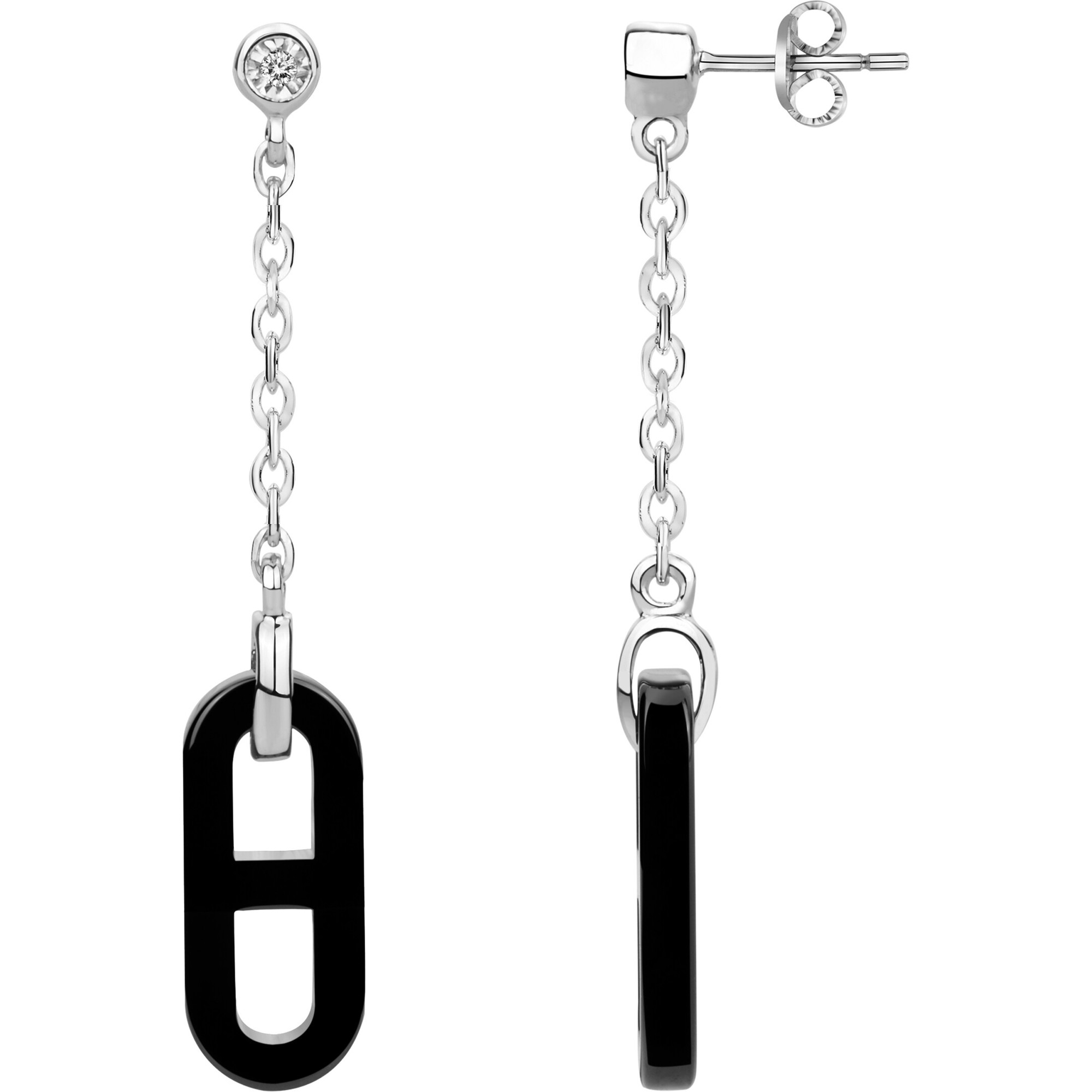 Leur maillon allongé en céramique noire contraste avec la brillance raffinée de l’argent 925 rhodié et la lumière subtile des oxydes de zirconium. L’ensemble crée une silhouette contemporaine et fluide, parfaite pour illuminer un port de tête avec élégance.