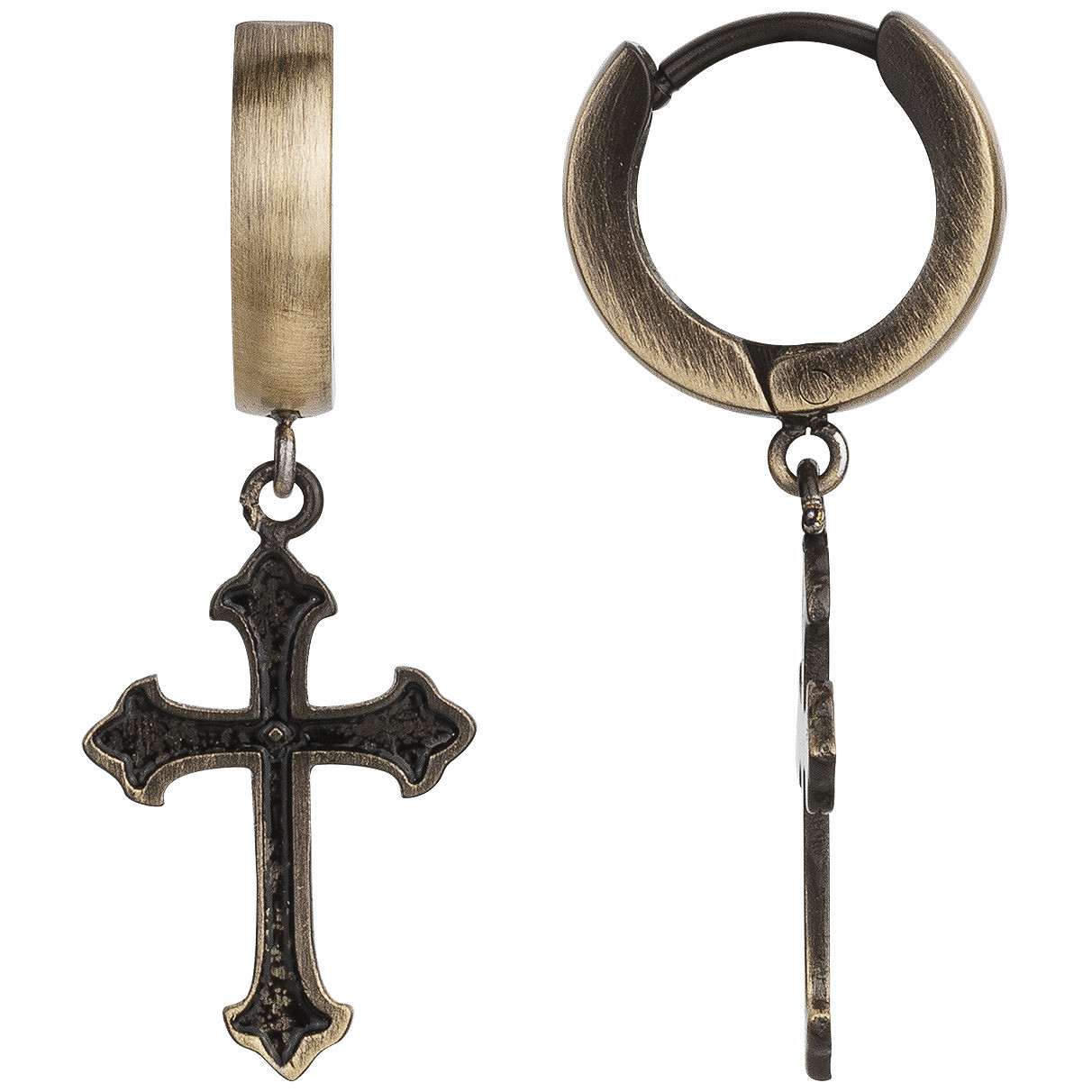 Créoles avec pendants croix gothiques en acier 316L inoxydable bronze et laque noire. Ce bijou a été conçu pour durer : garanti deux ans et fabriqué en acier inoxydable de qualité, il traverse les années sans s'abîmer. Son fermoir de type créole lui permet de rester bien en place à ton oreille. Un accessoire symbolique. Si tu recherches un bijou pour homme à l'allure vintage pour témoigner de ta spiritualité, ces boucles d'oreilles à croix Phebus sont faites pour toi. Ce symbole, tendance et intemporel, apporte un supplément d'âme à ton style.