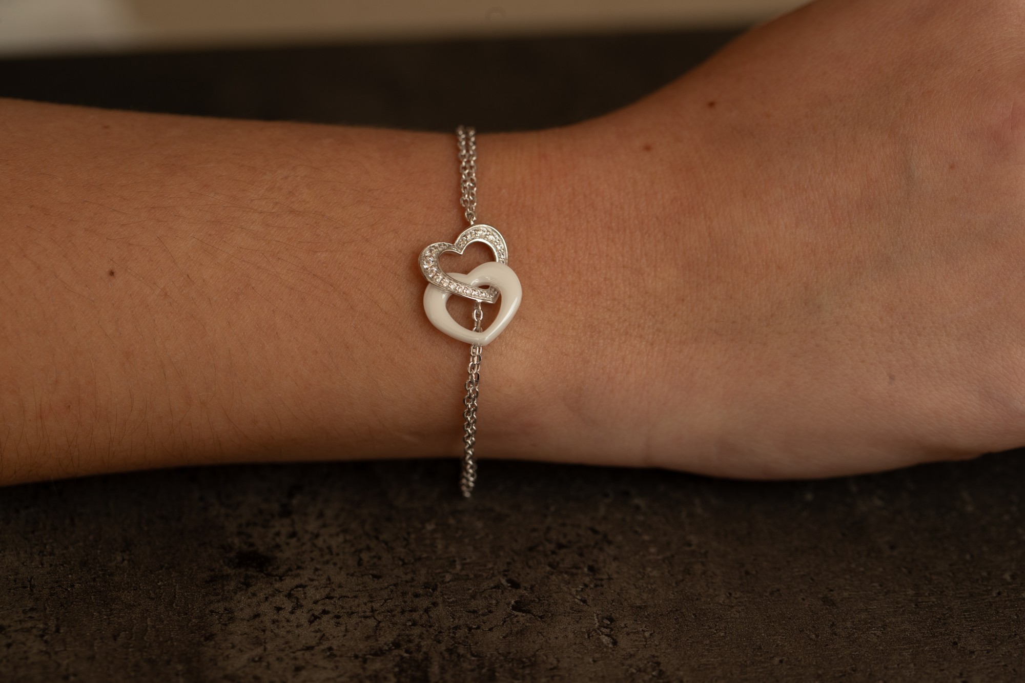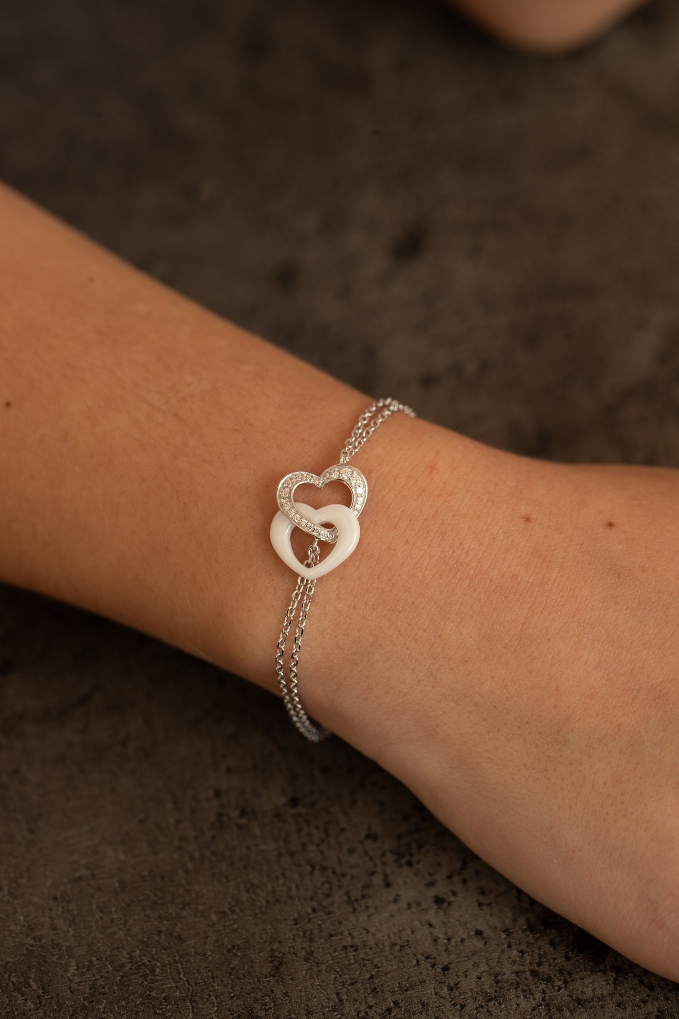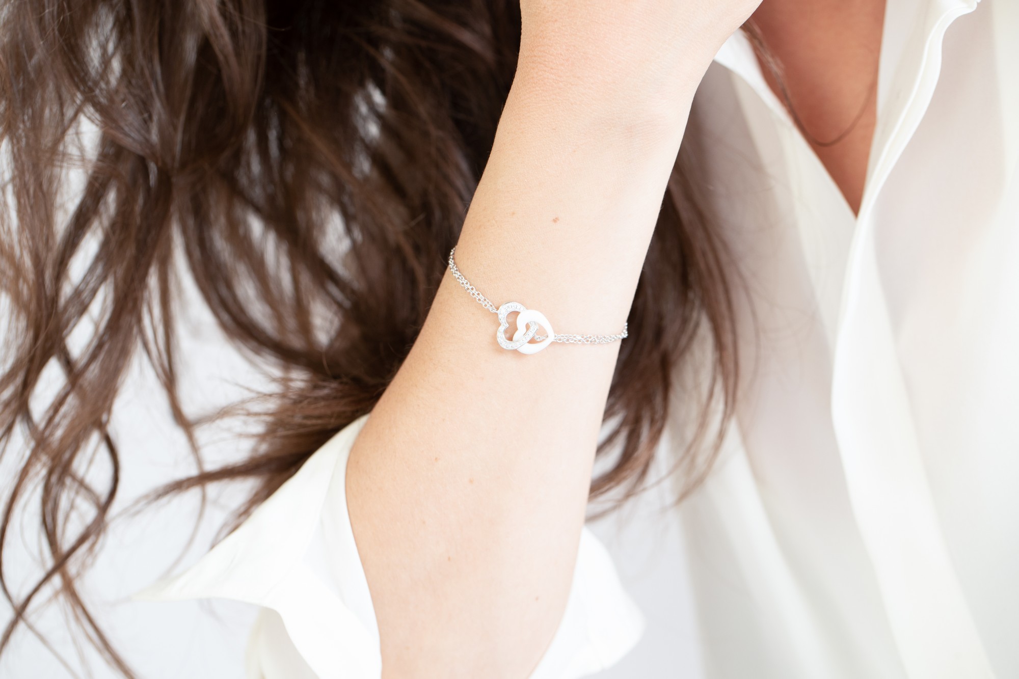 Le bracelet Velours évoque la tendresse d’un lien précieux. Deux cœurs entrelacés, l’un en céramique blanche, l’autre sublimé d’oxydes de zirconium, forment une harmonie parfaite entre éclat et douceur.