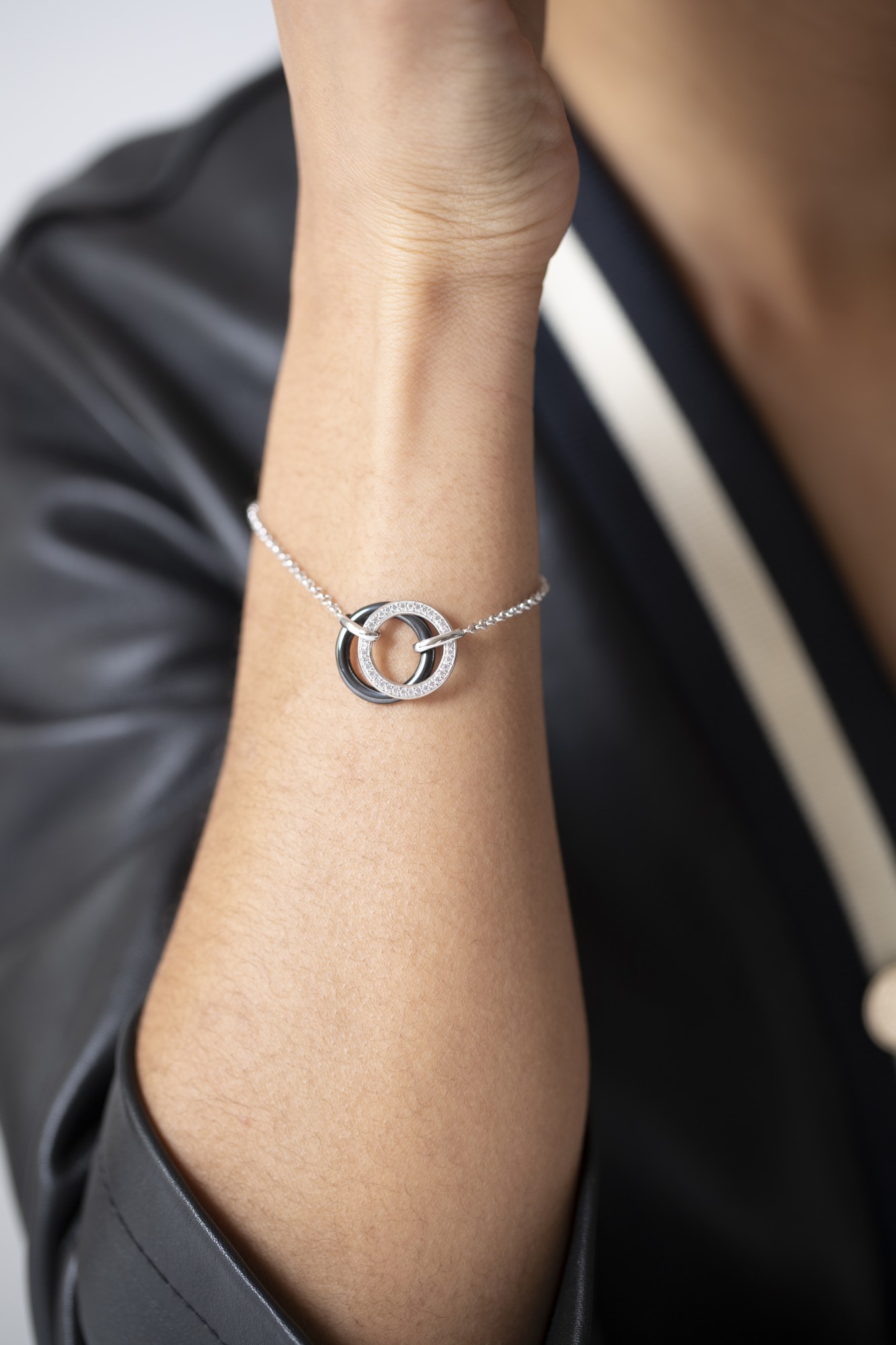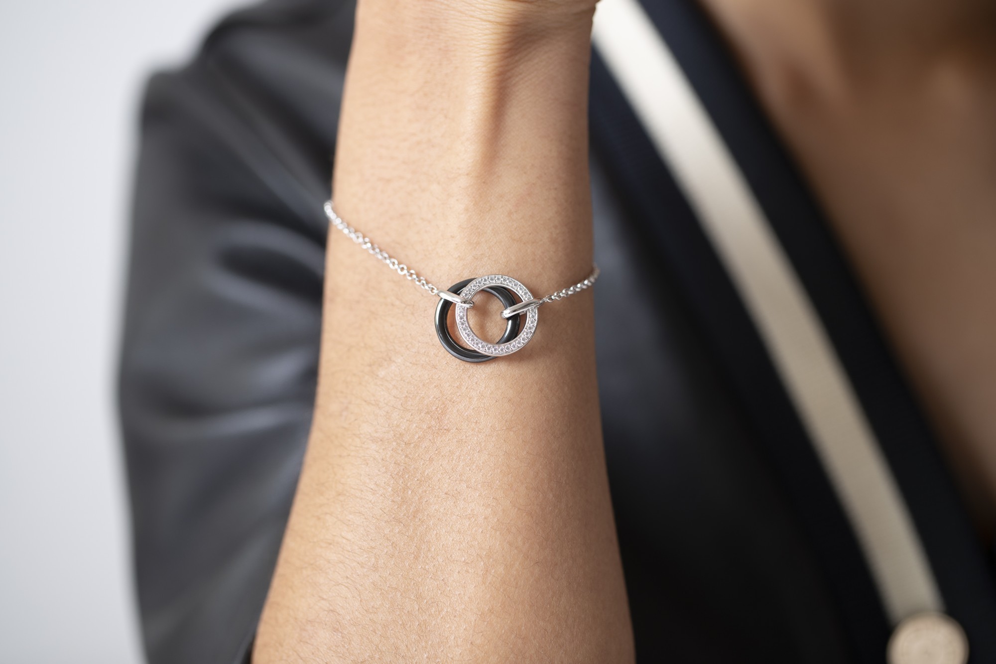 Un bracelet graphique qui joue sur l’équilibre parfait entre intensité et éclat. Son cercle central en céramique noire contraste avec l’argent 925 rhodié, sublimé par une délicate couronne d’oxydes de zirconium. Une création contemporaine qui capture la force du noir et la lumière du blanc, pour un bijou intemporel et raffiné.