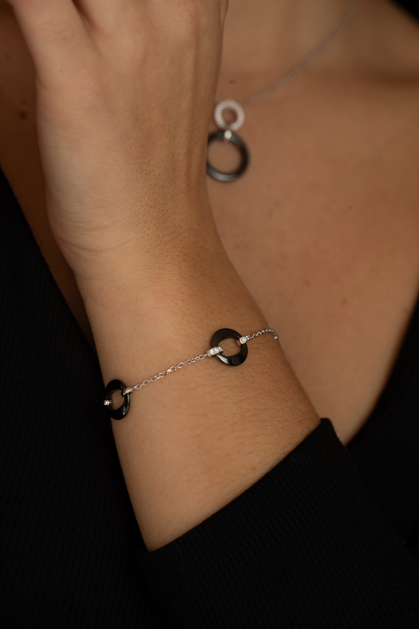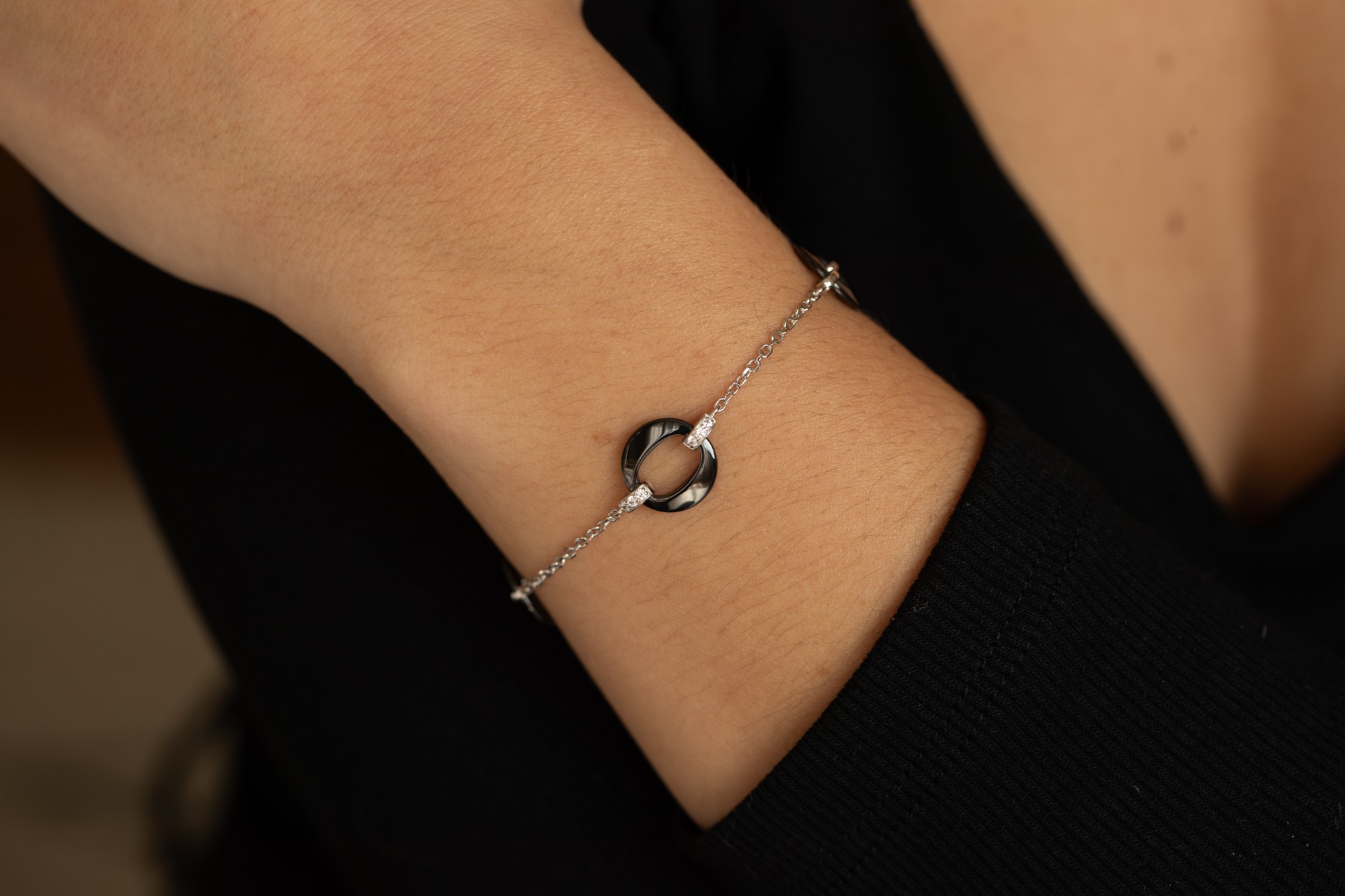 Le bracelet Byzantium en céramique noire exprime une élégance moderne et affirmée. Trois anneaux en céramique sombre rythment la chaîne fine et ajustable en argent 925 rhodié, jouant sur le contraste entre intensité et éclat. Sobre et graphique, ce bijou raffiné incarne un style contemporain et intemporel, pensé pour accompagner vos gestes avec distinction.