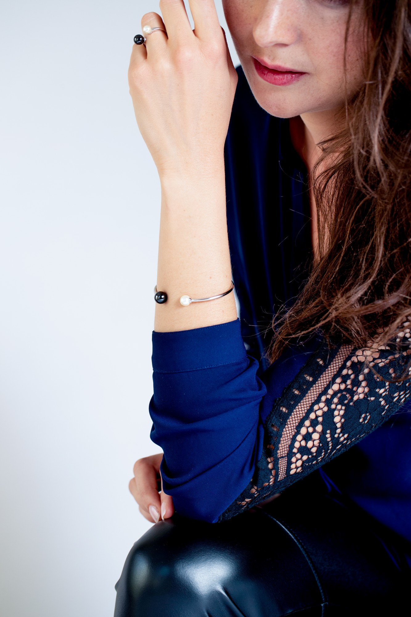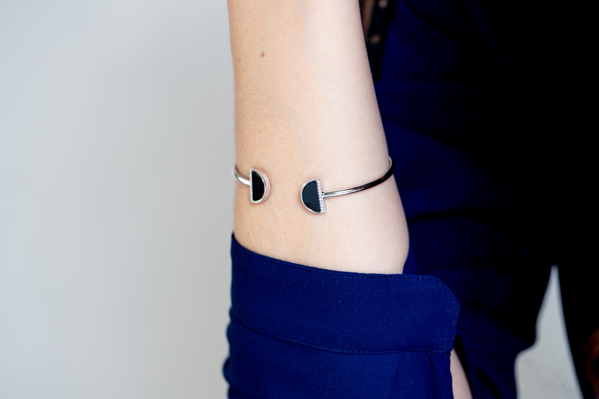 Le bracelet Nikko incarne l’élégance contemporaine dans sa forme la plus pure. Ce jonc ouvert en argent 925 rhodié s’orne de deux demi-cercles en céramique noire, soulignés d’oxydes de zirconium délicatement sertis. Son design symétrique et épuré reflète un équilibre parfait entre force et lumière.