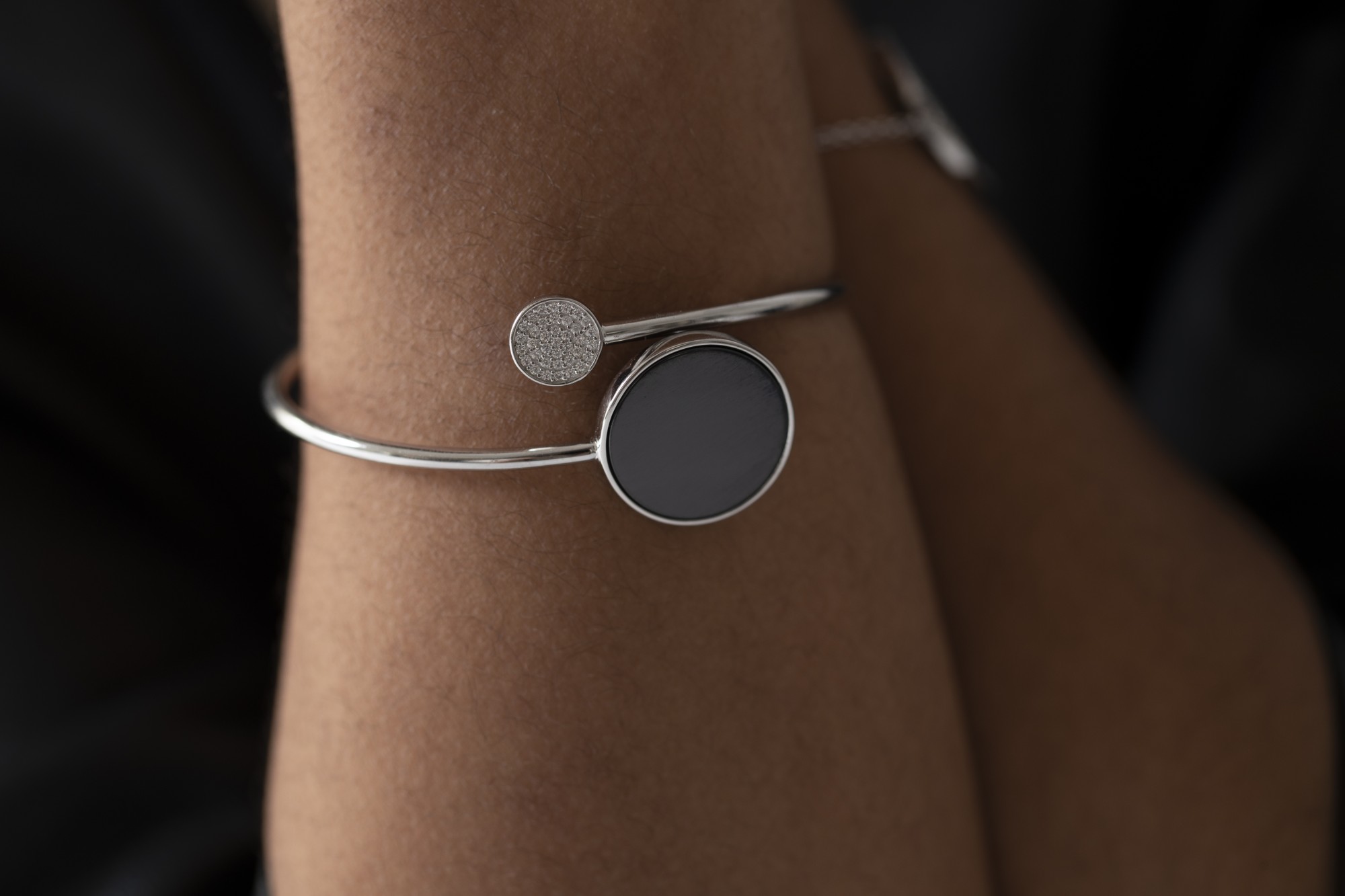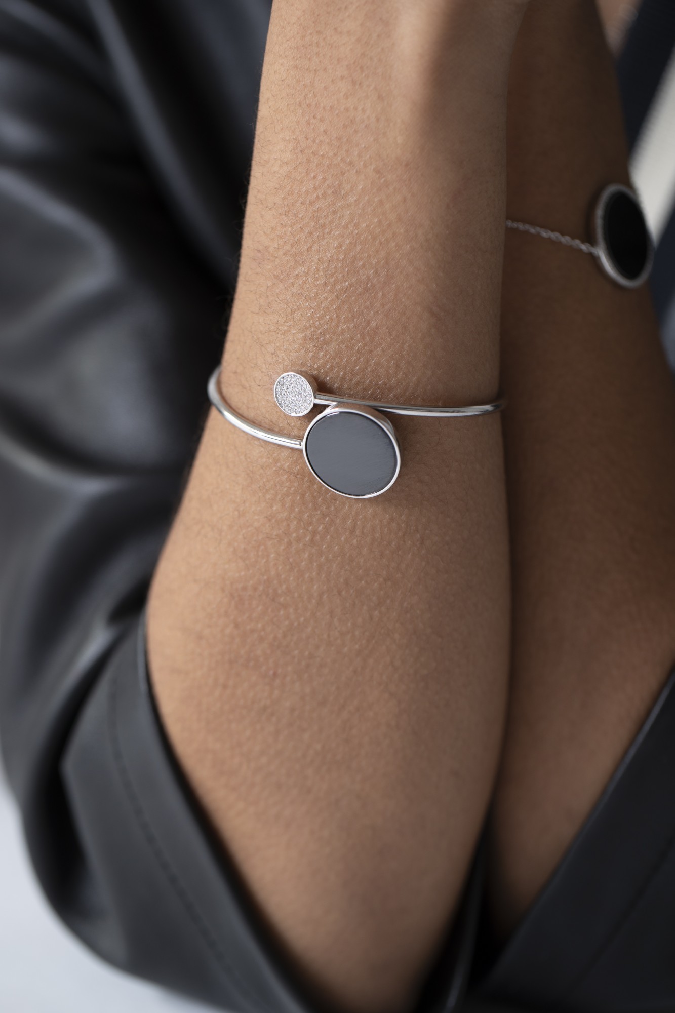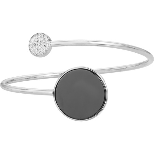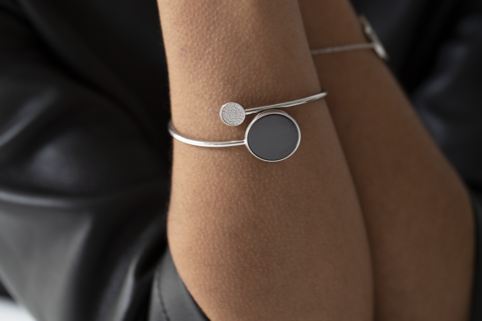 Le bracelet Présage joue sur l’équilibre parfait des formes et des contrastes. Son design ouvert relie la profondeur d’un disque en céramique noire à l’éclat d’un motif serti d’oxydes de zirconium, symbole d’harmonie entre ombre et lumière.