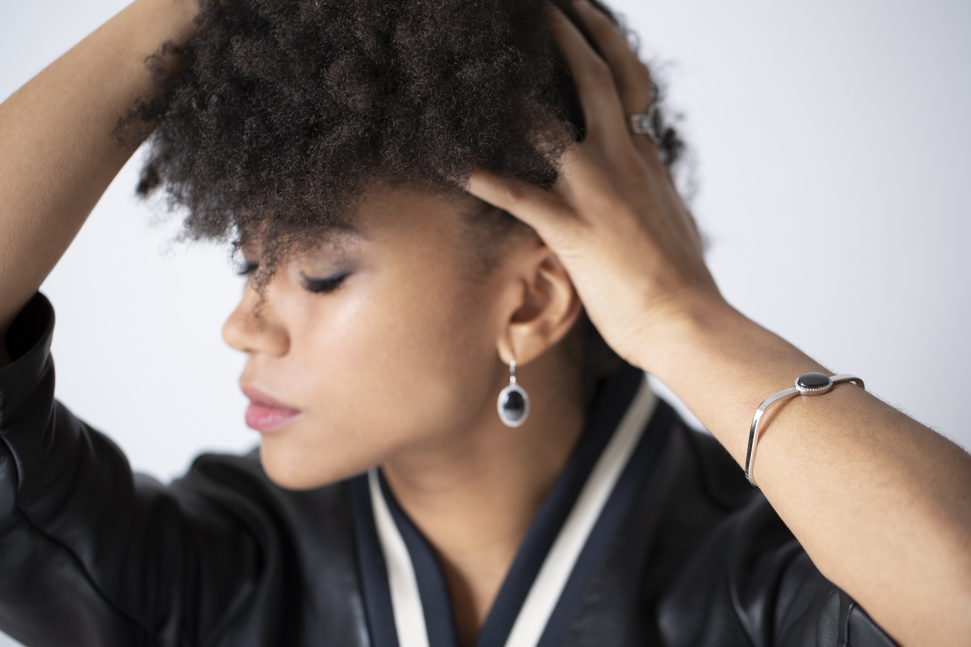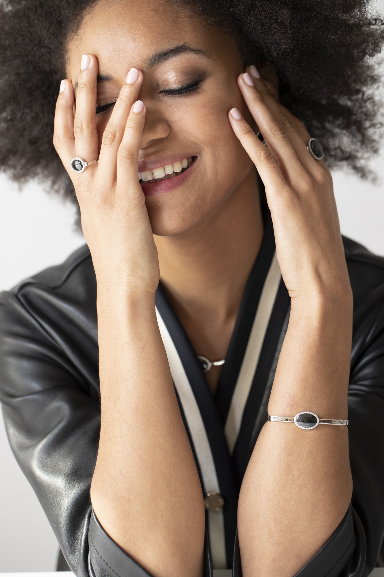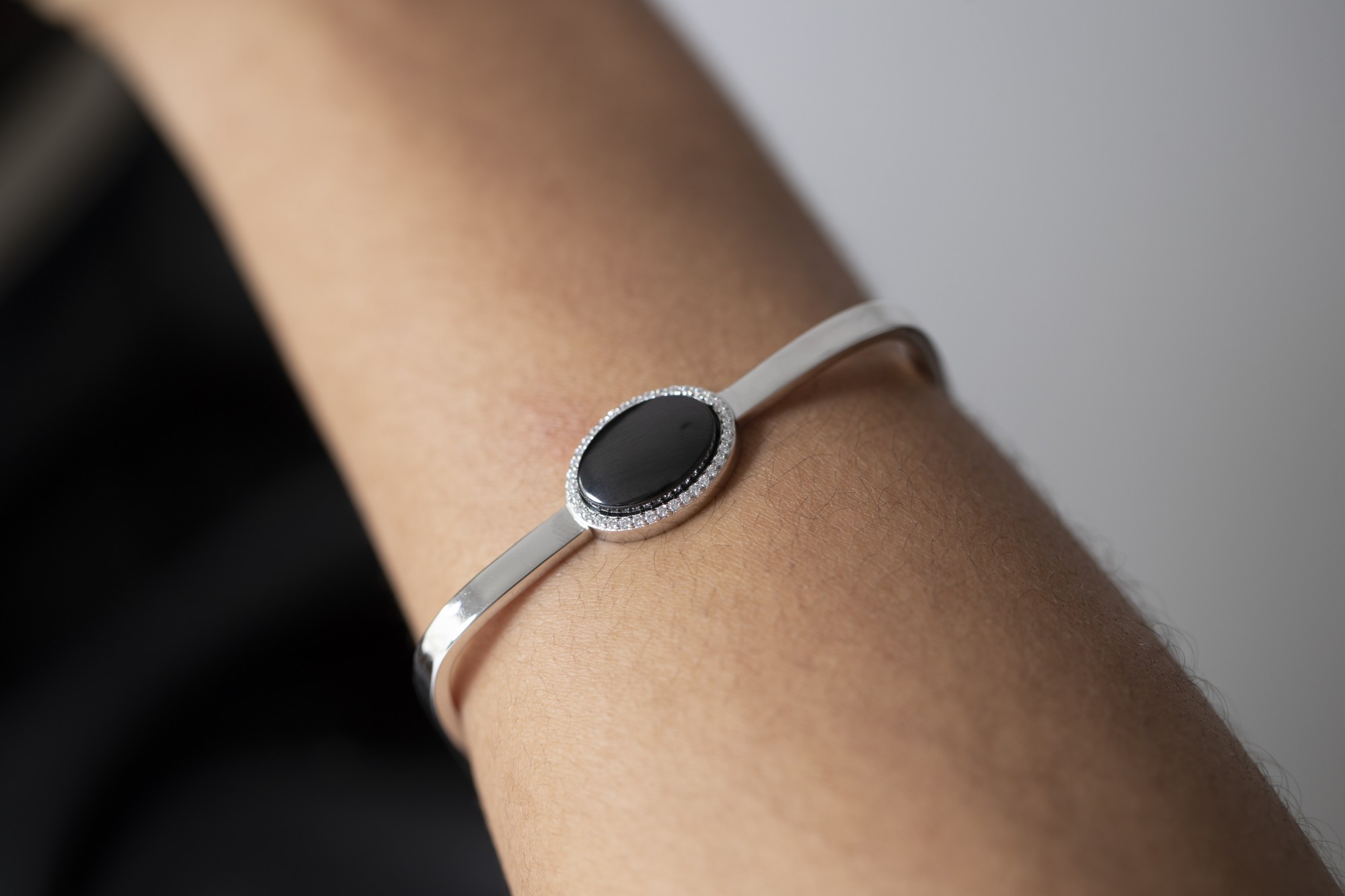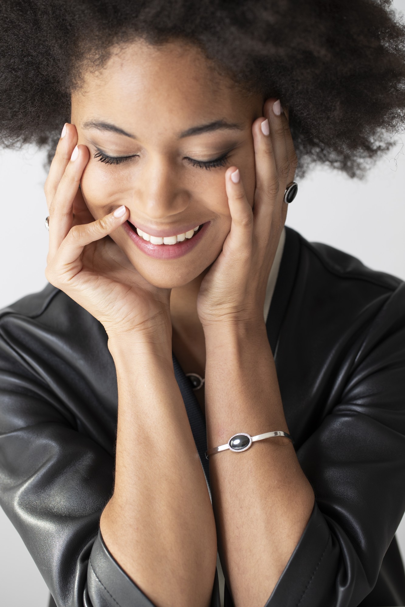 Le bracelet jonc Elegia séduit par l’originalité de son design et l’élégance de sa ligne. Contrairement aux joncs traditionnels, sa silhouette n’est pas ronde mais sculptée avec une forme affirmée qui souligne son caractère moderne et raffiné. Au centre, un cabochon de céramique noire intense, entouré d’oxydes de zirconium, capte la lumière et attire le regard.