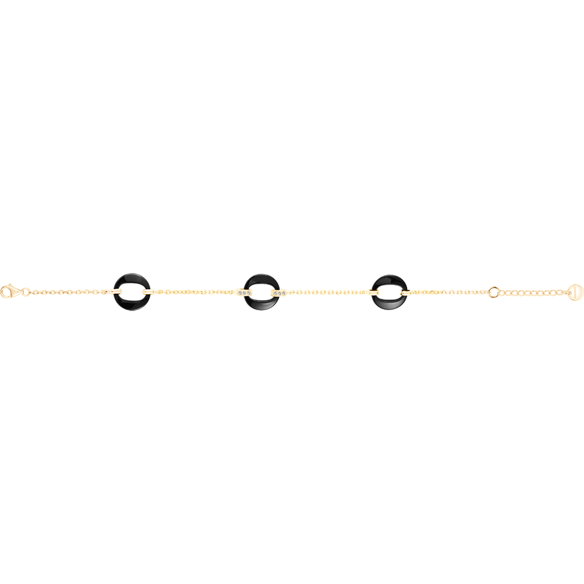 Entre ombre et lumière, le bracelet Fresque dévoile une allure graphique et précieuse. Trois cercles de céramique noire, sertis d’oxydes de zirconium, s’alignent sur une délicate chaîne en plaqué or 18 carats 750 millièmes. Le contraste saisissant du noir profond et des éclats de lumière crée un jeu visuel moderne et captivant.