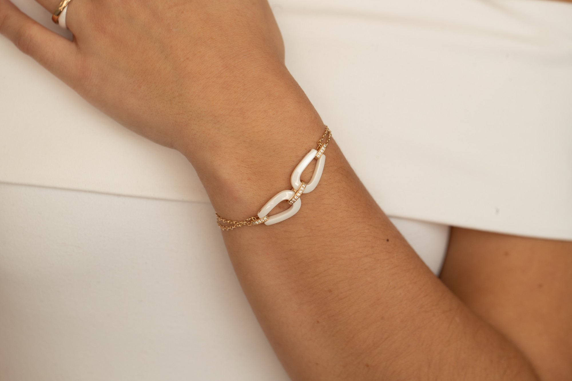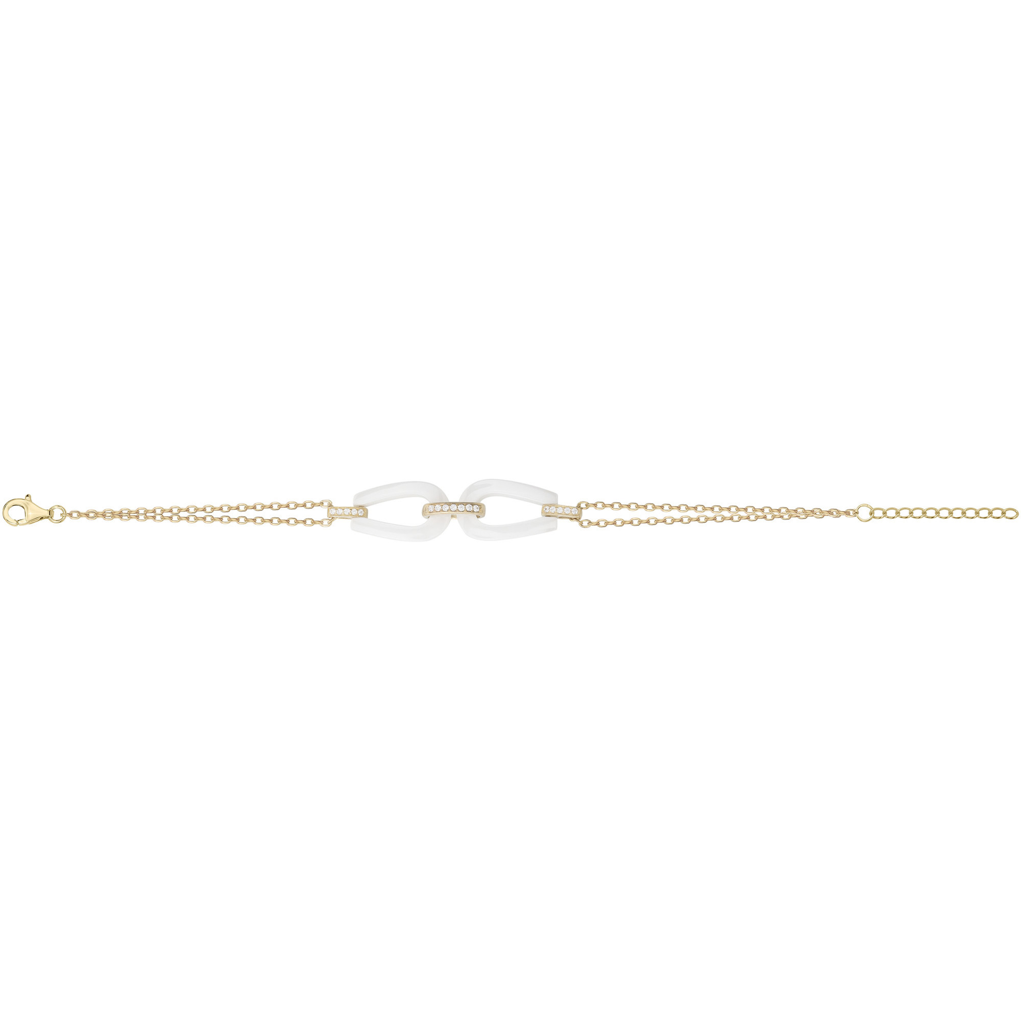 Le bracelet Amphore en céramique blanche et plaqué or 18 carats incarne un design contemporain aux lignes raffinées. Au centre, deux maillons en céramique s’unissent avec grâce, sublimés par une rangée d’oxydes de zirconium qui apporte éclat et luminosité. Son double rang de chaîne en plaqué or accentue l’élégance et la modernité de ce bijou intemporel. Ajustable, il s’adapte parfaitement à votre poignet pour offrir confort et raffinement au quotidien comme lors des plus beaux instants.
