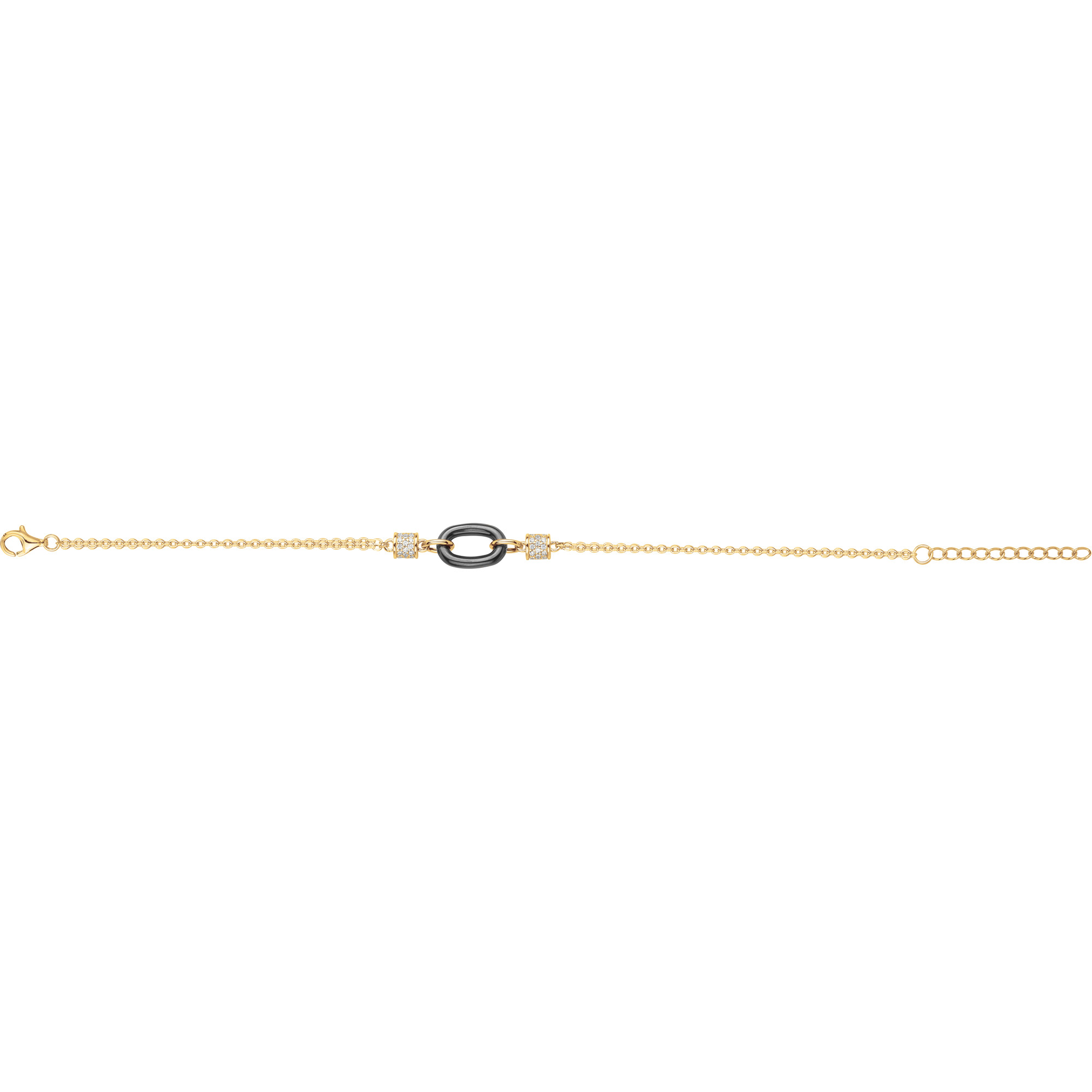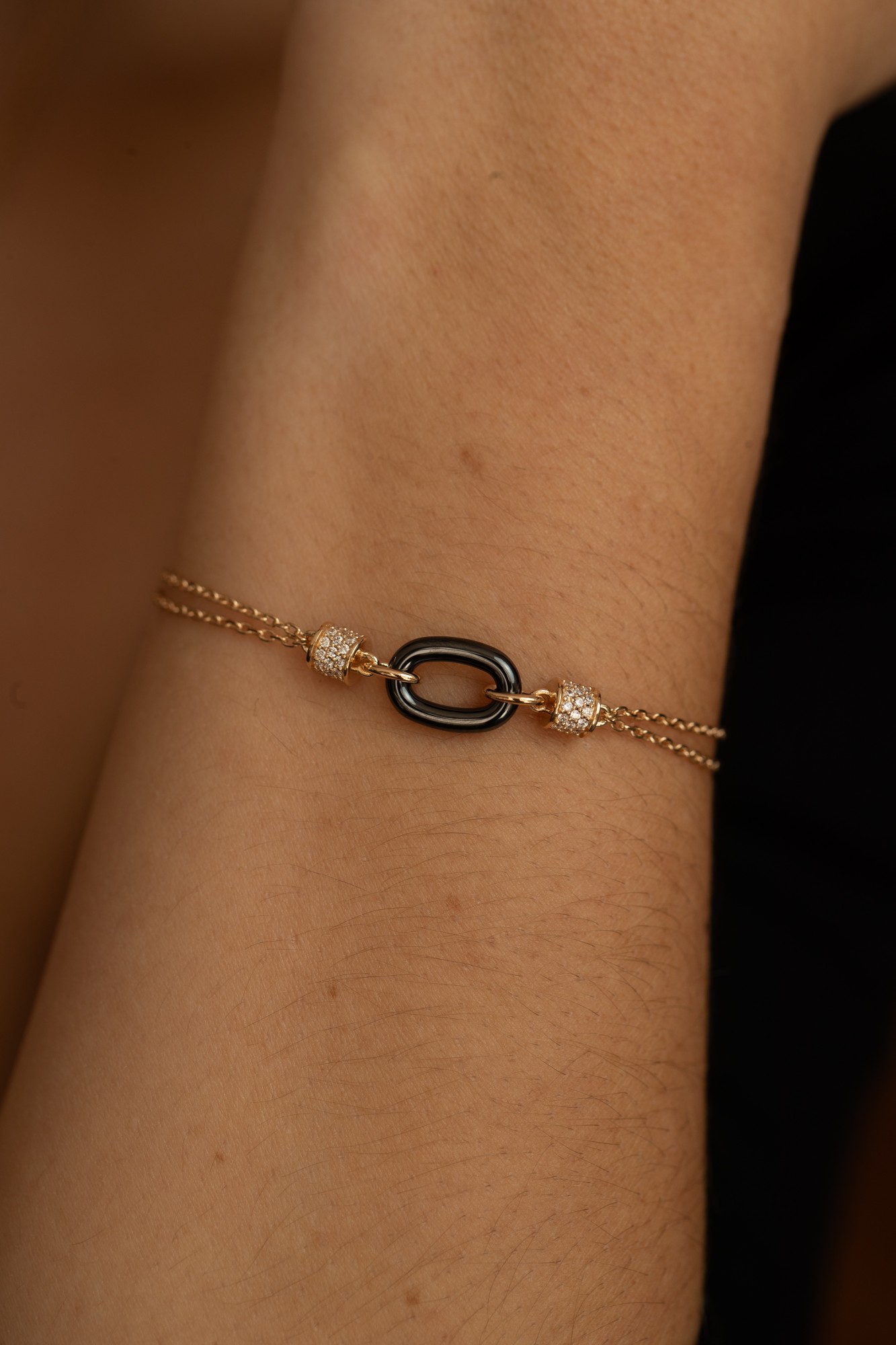 Le bracelet Sphère joue sur l’équilibre parfait entre contraste et lumière. En son centre, un maillon de céramique noire, intense et profond, se relie à deux éléments sertis d’oxydes de zirconium, capturant chaque reflet.