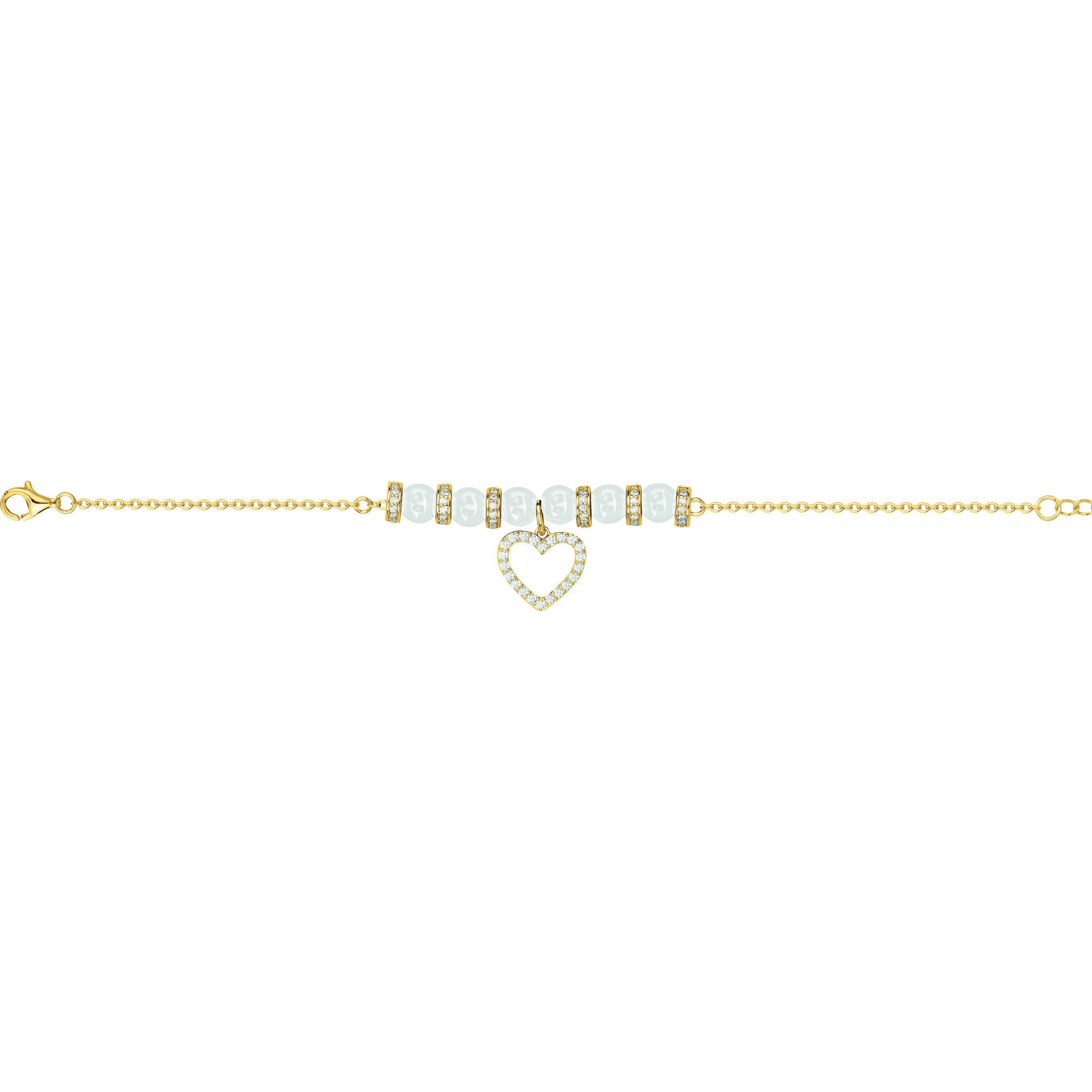 Le bracelet Jingdezhen allie raffinement et émotion dans une composition lumineuse. Ses perles de céramique blanche alternent avec des anneaux sertis d’oxydes de zirconium, formant un équilibre parfait entre éclat et douceur. En son centre, un cœur délicatement pavé se suspend à une chaîne fine en plaqué or 18 carats 750 millièmes.
