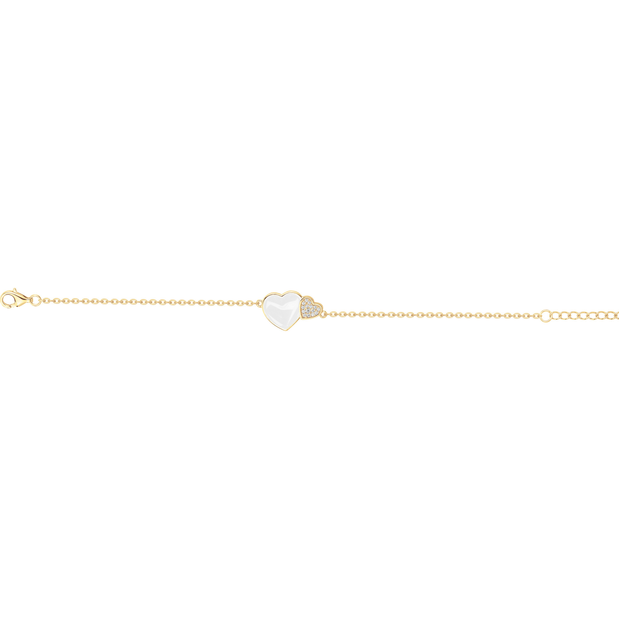 Deux cœurs entrelacés, l’un en céramique blanche, l’autre illuminé d’oxydes de zirconium, se rencontrent sur une fine chaîne en plaqué or 18 carats. Le bracelet Flamme célèbre l’union précieuse des sentiments et l’éclat d’une tendresse éternelle. Bijou délicat et raffiné, il se porte comme un gage d’amour et devient le cadeau idéal pour célébrer la Saint-Valentin, un anniversaire ou la fête des mères.