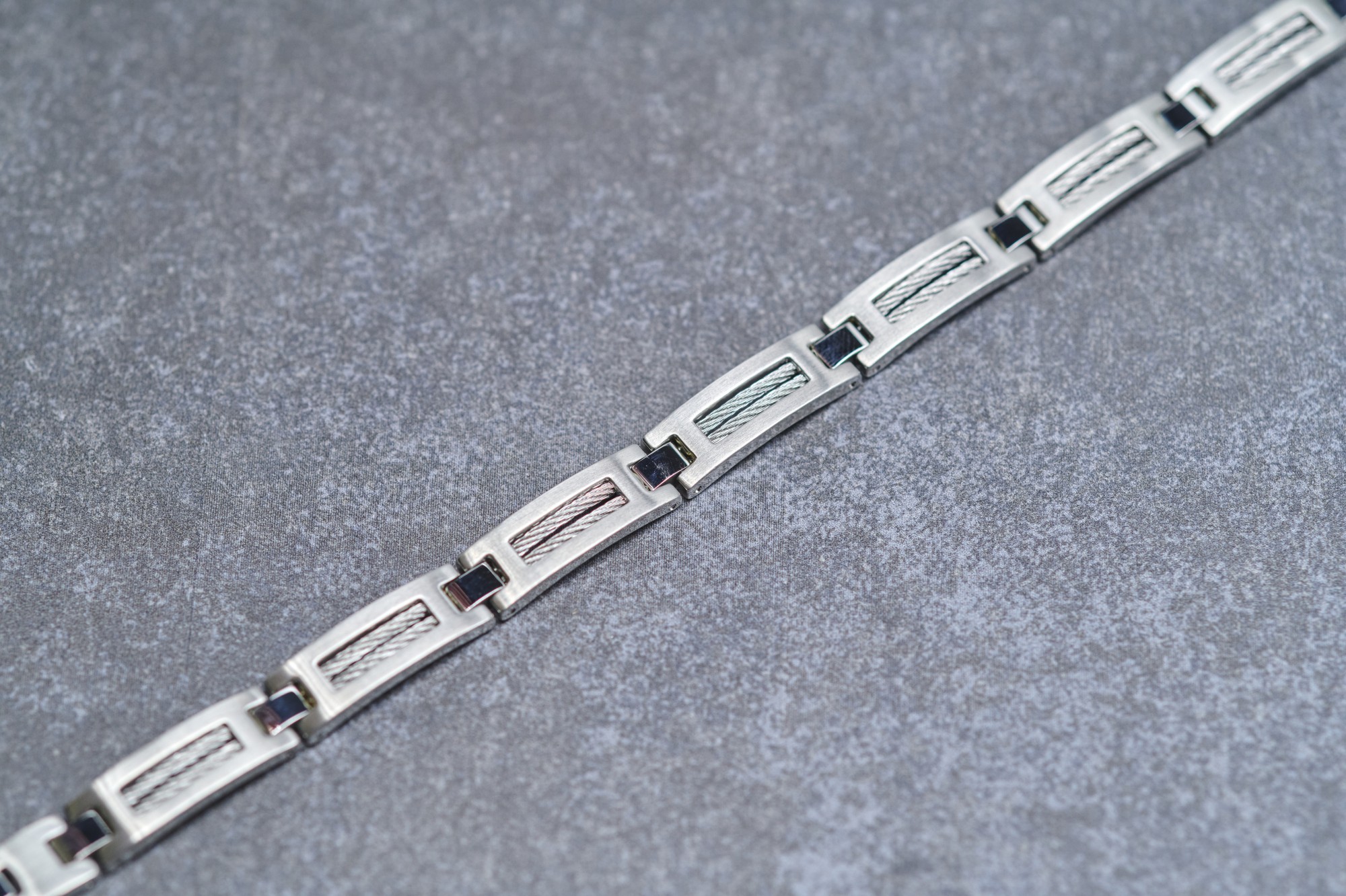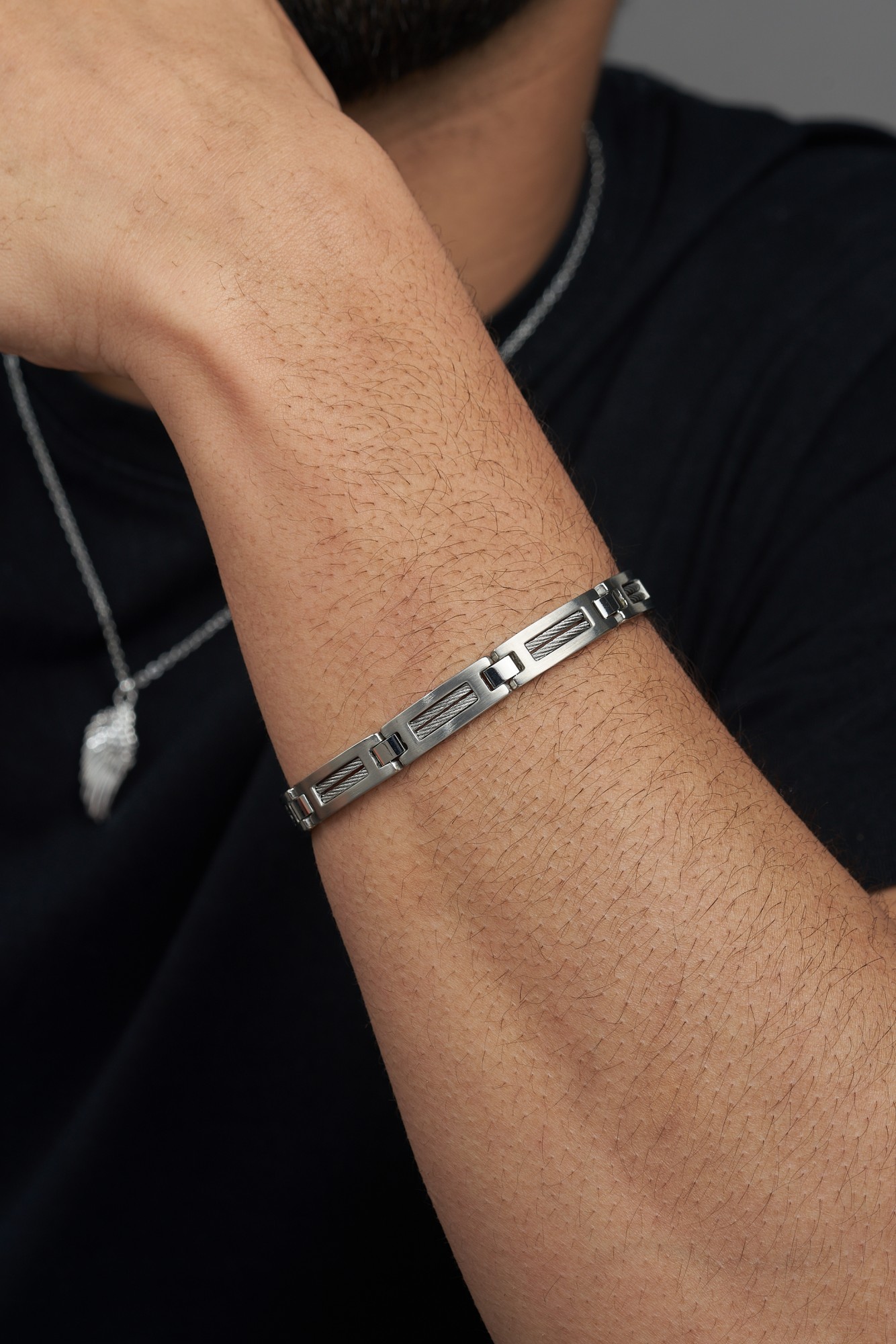 Un mélange durable d'acier inoxydable et de câble. Le bracelet Sasha pour homme séduit par la sobriété que lui confèrent l'acier 316L inoxydable et le câble gris. Sa fermeture est sécurisée par un fermoir à double clip, en plus, le bijou est garanti 2 ans. Un style monochrome pour un look sobre et élégant. Si tu cherches un bijou Phebus que tu peux porter tous les jours avec n'importe quel style, tu adopteras facilement le bracelet Sasha. Il te donnera un look élégant en toutes circonstances. Ses lignes franches et son aspect brut t'aideront à affirmer ton style avec esthétisme.