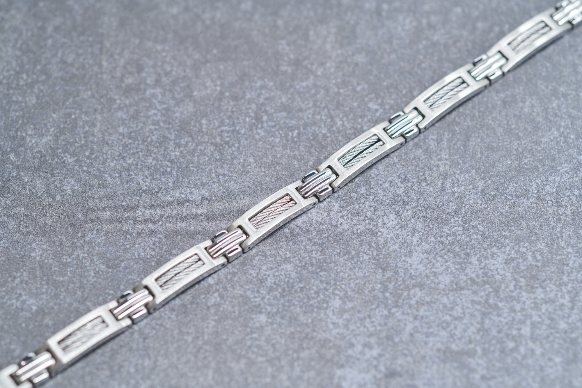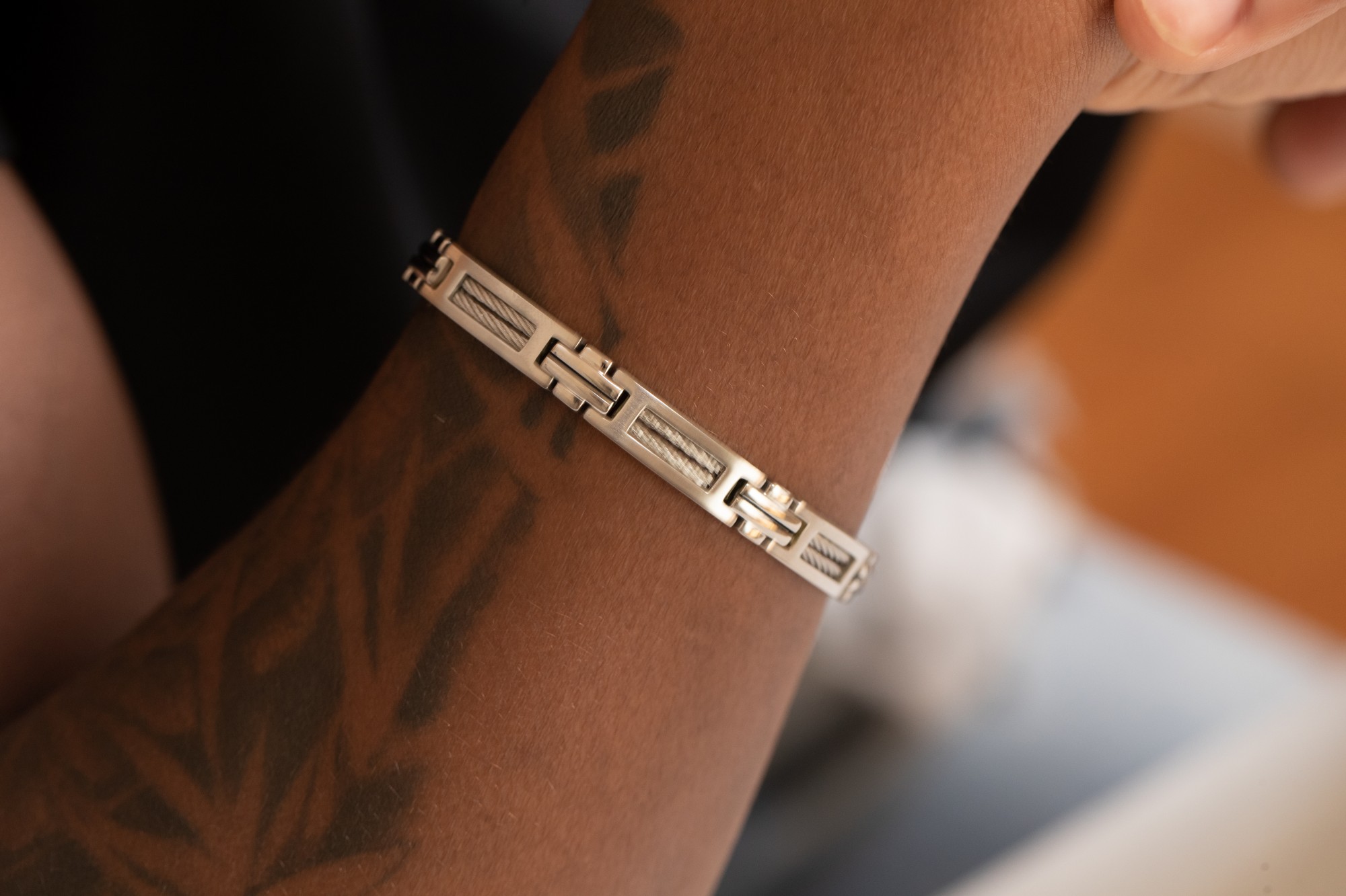 Toute la beauté et la solidité de l'acier inoxydable. Garanti 2 ans, le bracelet Boa de Phebus est fabriqué à partir d'une base en acier 316L inoxydable blanc brillant, qui enserre des câbles gris. Réglable de 19,5 cm à 21 cm, il est doté d'un fermoir à double clip sécurisé. Un style monochrome très contemporain. Assez discret, ce bijou sait tout de même se faire remarquer ! Il apporte une légère touche d'élégance à tes tenues, la journée ou lors d'une soirée. Un allié indispensable pour les hommes résolument dans l'air du temps.