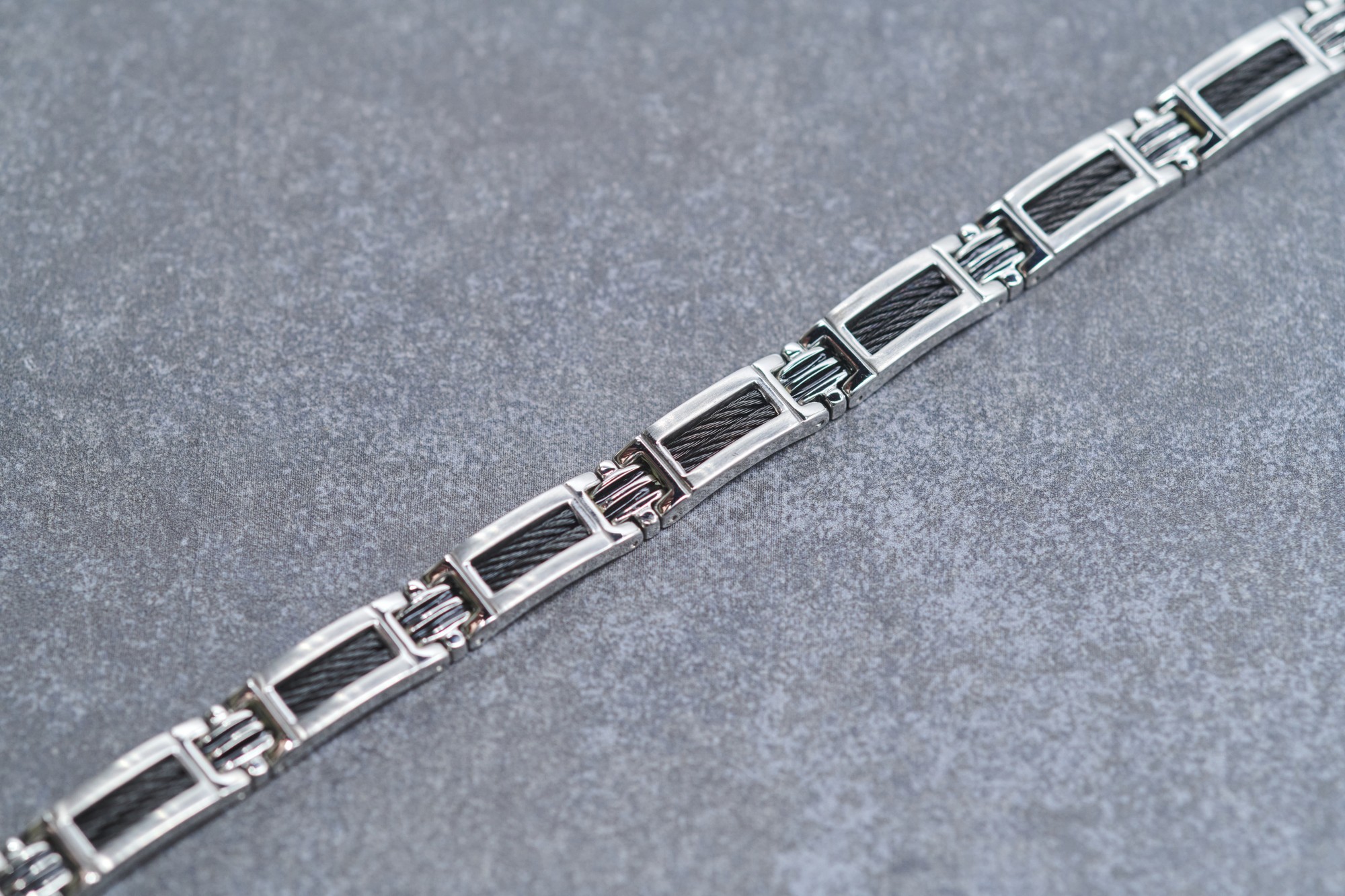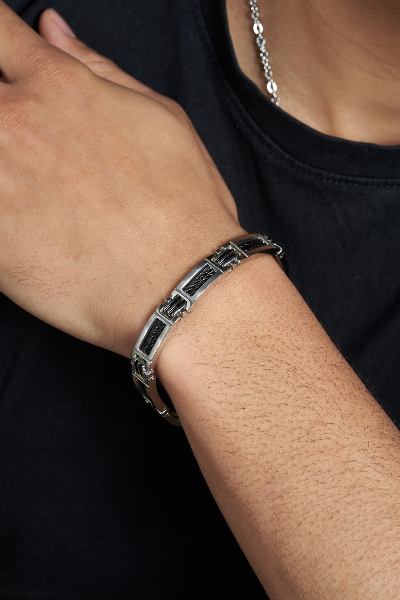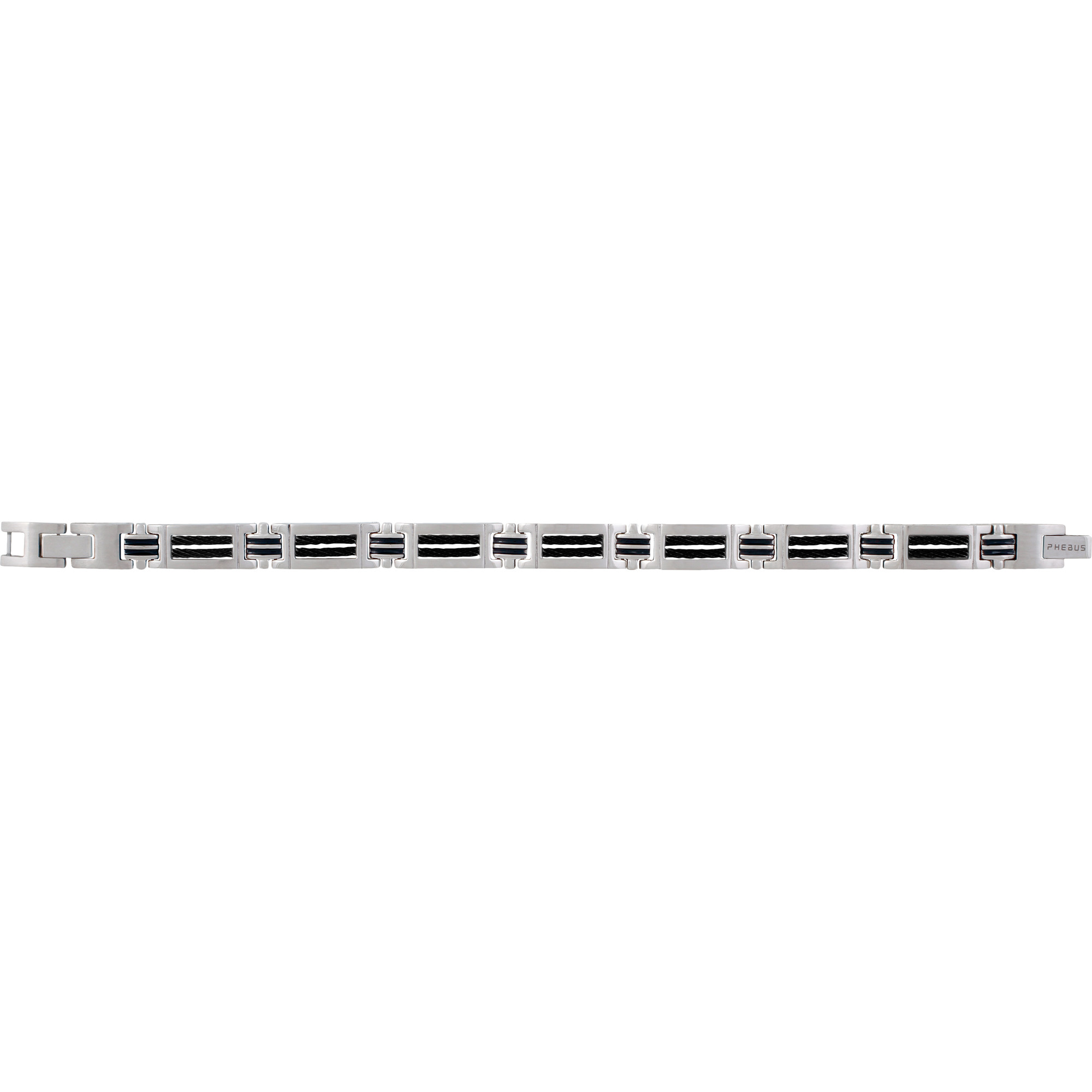 De l'acier inoxydable pour plus de solidité. Le bracelet Léandre pour homme est composé de câble gris, de résine noire, mais surtout d'acier 316L inoxydable, qui le rend particulièrement durable. Il se fixe avec un fermoir à double clip et bénéficie d'une garantie de 2 ans. Un design masculin et original. Avec ses éléments en acier, en câble et en résine, le bracelet Léandre de Phebus est un bijou assurément masculin, profitant de lignes originales. Il s'agit du bracelet parfait si tu cherches un bijou à porter au quotidien pour affirmer ton style sans effort.
